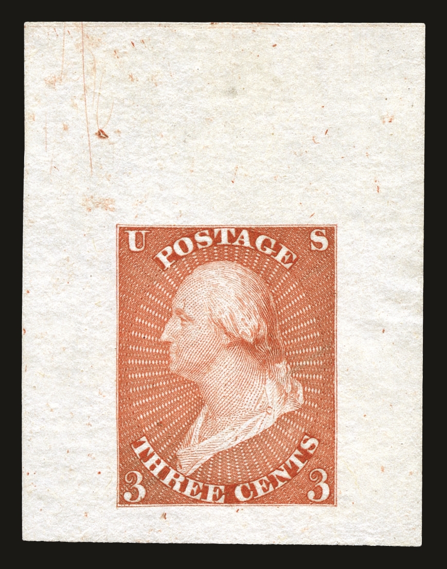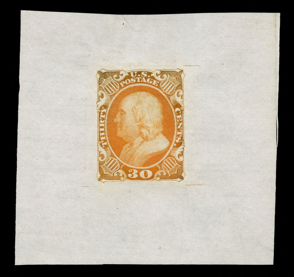 (38P1) 1857-61 30¢ orange Franklin large die proof on India, 58 x 56mm, off card. Slightly oxidized, but still an attractive and well-balanced example of this rare 30¢ die proof.