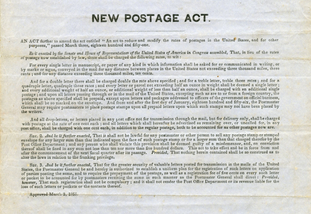 Effective April 1, 1855, the single rate of postage on a letter traveling under 3,000 miles is 3 cents, and 10 cents for distances over 3,000 miles.