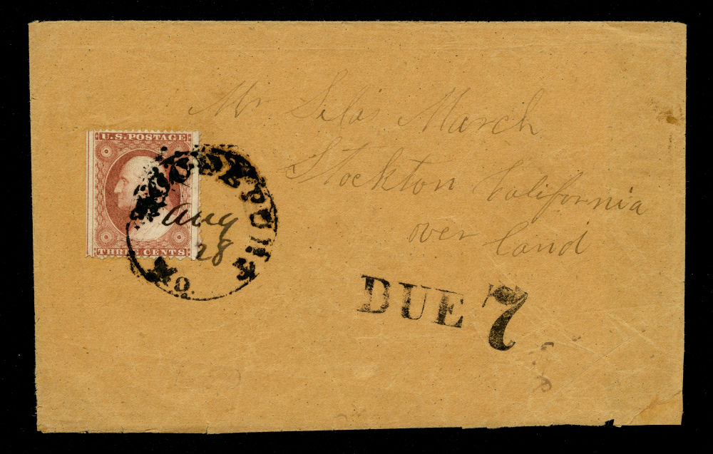 (26) 1857-61 3¢ dull red Washington Type III tied by black “Rocheport, Mo” cds with "Aug 28" written in pen on cover addressed to Stockton, California with manuscript "Overland" below address. The stamp underpaid the 10¢t transcontinental overland rate so a straightline "Due 7" handstamp applied at left. Cover with a small piece added at bottom right corner not affecting the overall fine appearance of this Missouri to California overland use.With 2025 Philatelic Foundation certificate.