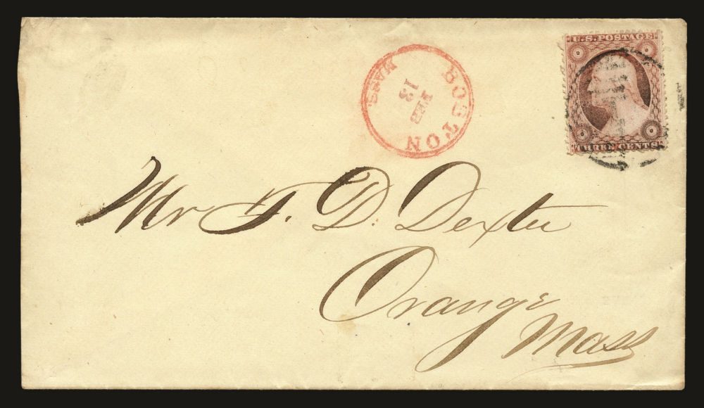 (26) 1857-61 3¢ dull red Washington Type III, position 87R15, clearly displaying a dramatic double transfer with rosettes doubled and a strong line running through both “U.S. POSTAGE” and “THREE CENTS,” tied by a grid cancel on cover to Orange, Massachusetts. Red “Boston, Mass. Feb 13” cds at top. This position from Plate 15 is one of the most prominent double transfers found on the 1857–61 3¢ Issue with this position one of the most highly sought-after plate positions. Stamp with three repaired perforations at top along with light scuffing, still a fine example of this rare position used on cover.