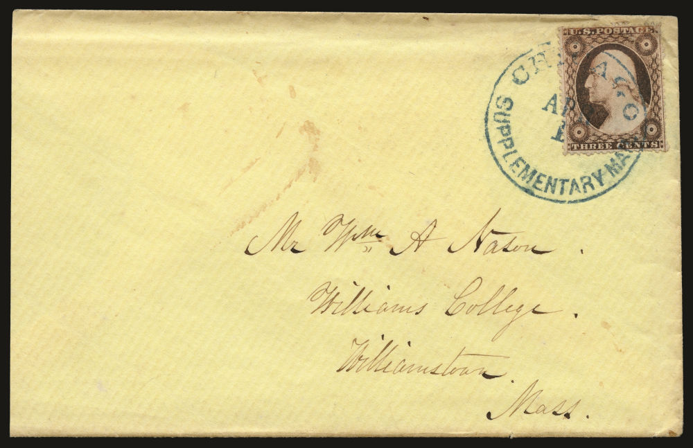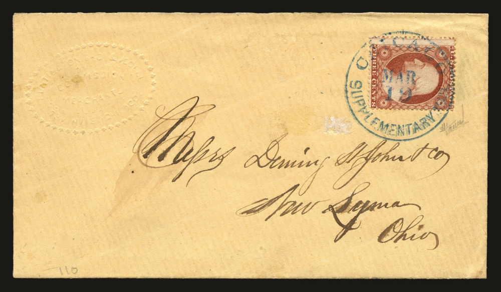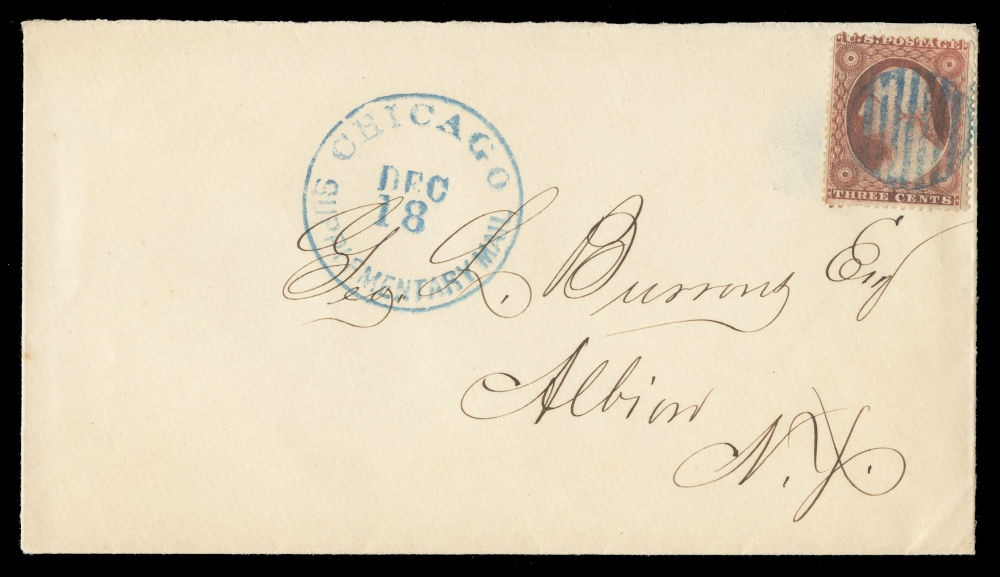 (26) 1857-61 3¢ dull red Washington Type III tied by blue grid cancel on cover with matching bold “Chicago Supplementary Mail Dec. 18” cds, addressed to Albion, New York. A fresh and very fine example of supplementary mail service, accepted after the regular mail bag closed and carried on a scheduled steamer departure—typically requiring prepayment in cash equal to standard postage.