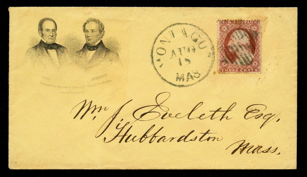 (26) 1857-61 3¢ dull red Washington Type III tied by black grid cancel with matching "Montague Mass. Aug 15" cds on 1860 Constitutional Union Party campaign cover to Hubbardston, MA, stamp with slight perf toning. The cover features a finely engraved dual portrait of presidential candidate John Bell and his running mate Edward Everett at upper left, with "Bell. Everett." caption below and imprint of Carpenter & Allen, 247 Washington St., Boston.
