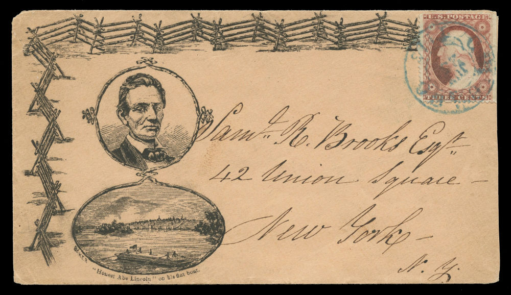 (26) 1857-61 3¢ dull red Washington Type III tied by blue "Chicago, Ills Jun 25" cds on 1860 Lincoln presidential campaign cover addressed to Samuel R. Brooks at 42 Union Square in New York City, with ornate illustration and captioned “Honest Abe Lincoln on his flat boat.” Striking design features a boldly engraved portrait of Abraham Lincoln, with a lower vignette depicting Lincoln’s flatboat journey down the Mississippi—an image that reinforced his frontier roots and “log cabin” candidacy during the 1860 presidential campaign. The illustrated panels are framed by a split-rail fence motif along the top and left borders. A very fine example of this highly desirable 1860 Lincoln campaign cover in sound condition. Milgram AL-81, with 2001 Philatelic Foundation certificate.