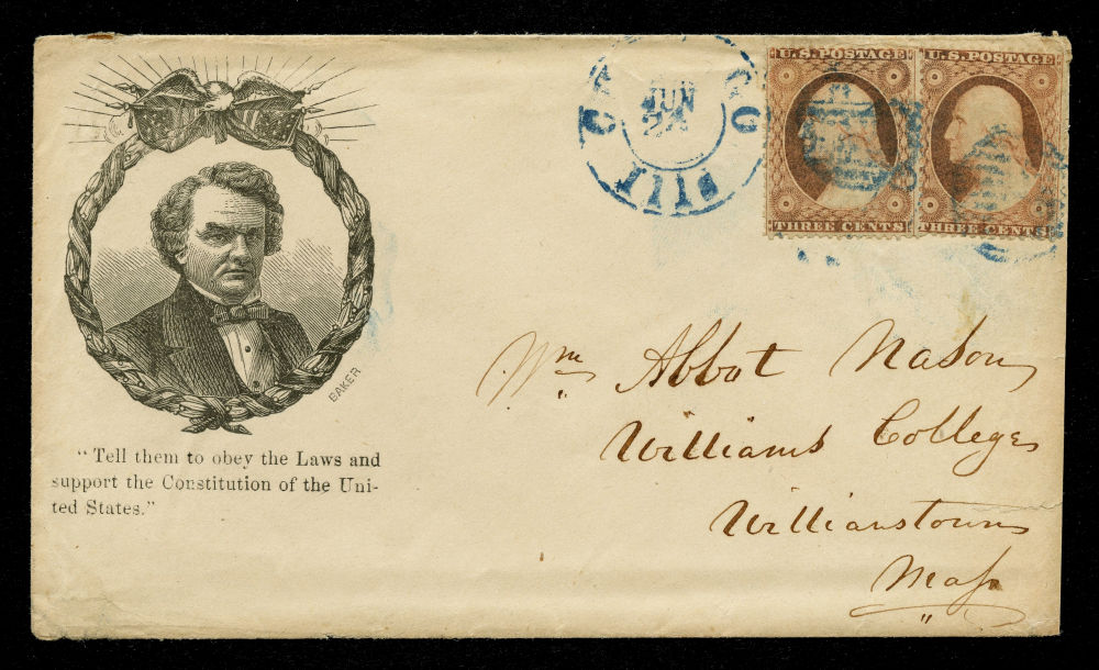 (26) Two 1857-61 3c dull red Washington Type III singles tied by blue "Chicago Ills Jun 23” cds on 1861 patriotic mourning cover to Williamstown, Massachusetts, with elaborate printed portrait of Senator Stephen A. Douglas, framed by a laurel wreath and surmounted by a mourning eagle and draped flags. Caption below reads: “Tell them to obey the Laws and support the Constitution of the United States.”