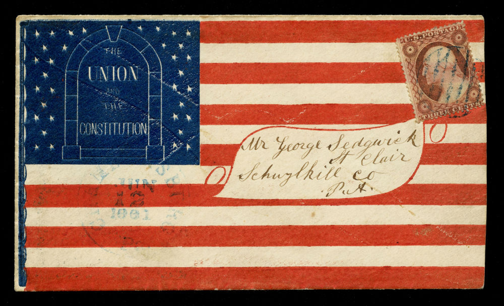 (26) 1857-61 3¢ dull red Washington Type III tied by blue circular grid cancel on wonderful red, white, and blue all-over flag design Union patriotic cover from Chambersburg to St. Clair, Pennsylvania with "Chambersburg, PA June 12 1861" cds struck at left, very fine.