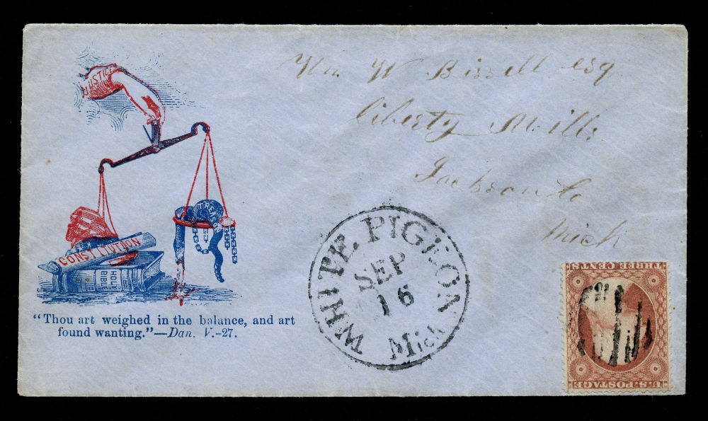 (26) 1857-61 3¢ dull red Washington Type III used by black grid cancel on beautiful U.S. Civil War patriotic cover from White Pigeon to Liberty, Jackson County, Michigan, "White Pigeon Mich Sep 16 (1861)" cds at center. Stunning patriotic imagery at left features "Thou Art Weighed in the Balance, and Art Found Wanting" below red and blue design showing "Constitution" over the "Holy Bible" outweighing treason snake on a hand-held scales of justice. A desirable patriotic cover with an 1857-61 3c stamp which was officially demonetized a month earlier.