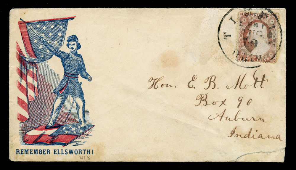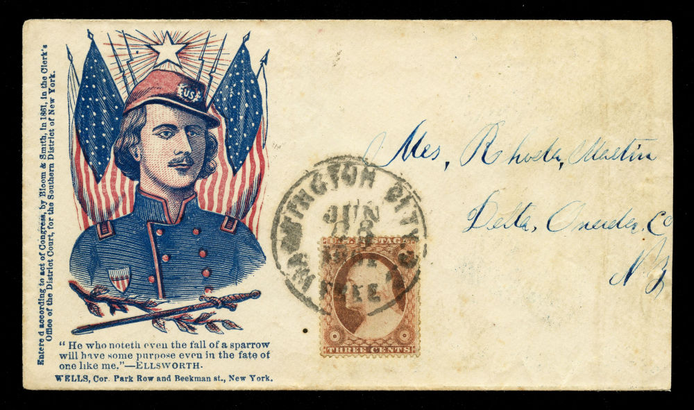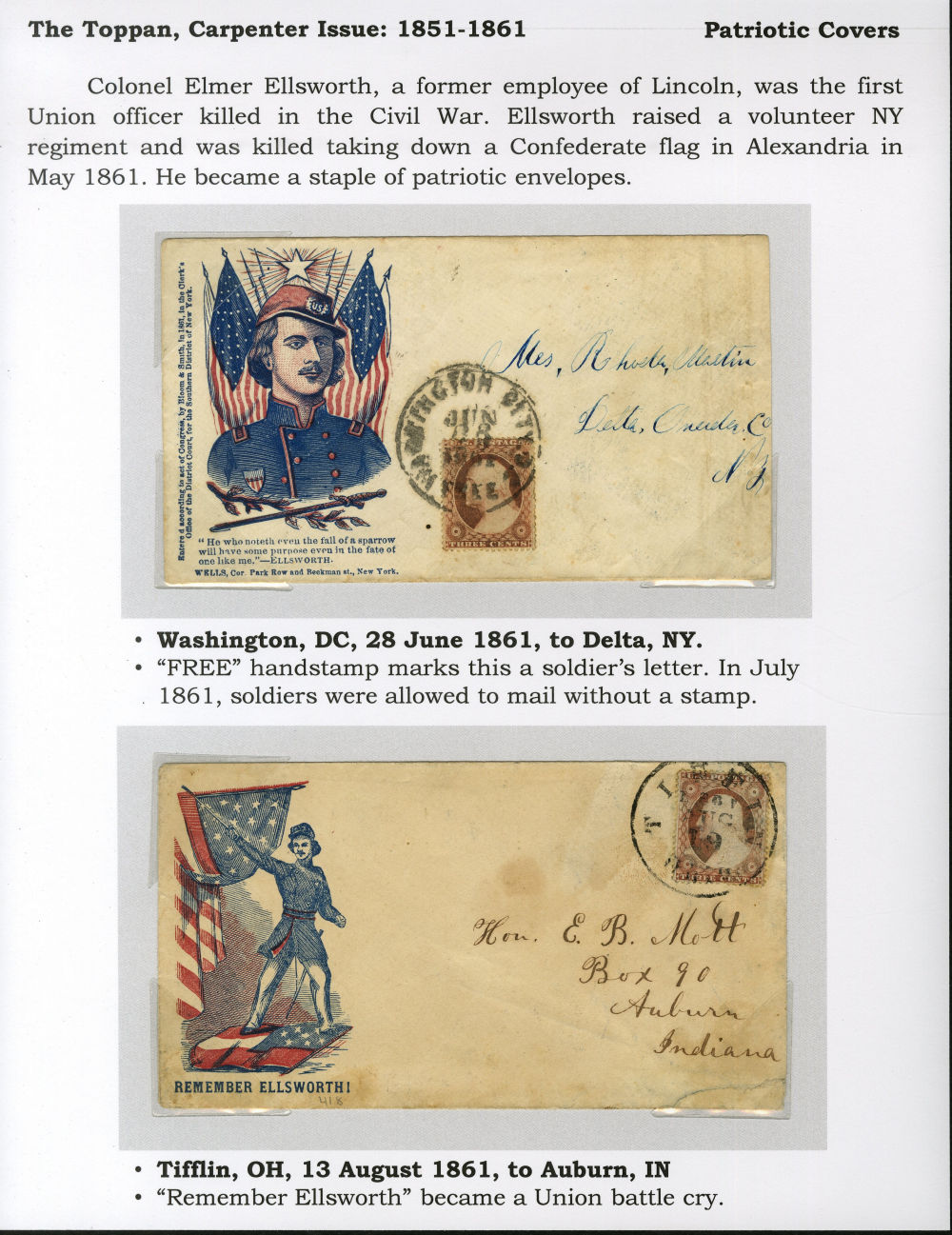 (26) Pair of patriotic covers commemorating Colonel Elmer Ellsworth, the first Union officer killed in the Civil War, both mounted on exhibit page, each franked with a (26) 3¢ 1857–61 dull red Washington Type III stamp. The first is a striking red and blue design depicting Ellsworth with crossed U.S. flags, a radiant starburst, and the quote “He who noteth even the fall of a sparrow will have some purpose even in the fate of one like me.” Mailed from Washington, D.C., to Delta, New York on 28 June 1861 with the stamp tied by Washington City "FREE" cds; this was a soldier’s letter sent shortly before formal postage exemptions went in effect in July 1861. The second cover features a dramatic “Remember Ellsworth!” patriotic design of Ellsworth standing over a Confederate flag, stamp tied by Tiffin, Ohio cds dated August 19, 1861. Both covers show the immediate popular response to Ellsworth’s death, which became a rallying cry for the Union cause. The second cover with wear around stamp and repaired tear at bottom right, but overall a visually compelling and fine pair.