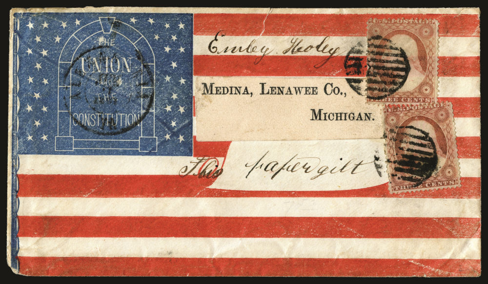 (26) Two 1857-61 3¢ dull red Washington Type III singles tied by black grid cancels on red, white, and blue all-over flag design Union patriotic cover from Alexandria, Virginia to Medina, Michigan. Alexandria July 1861 cds struck at left, a matter of days after the updated U.S. flag officially came into effect on July 4, 1861, following Kansas’s admission to the Union. The double-weight franking reflects the enclosed letter’s heavier contents. A visually striking and historically significant Union patriotic usage, combining July 1861 usage of the 34-star flag design with a postmark from the recently reoccupied city of Alexandria, Virginia. Some edge wear and a backflap tear but overall fine.