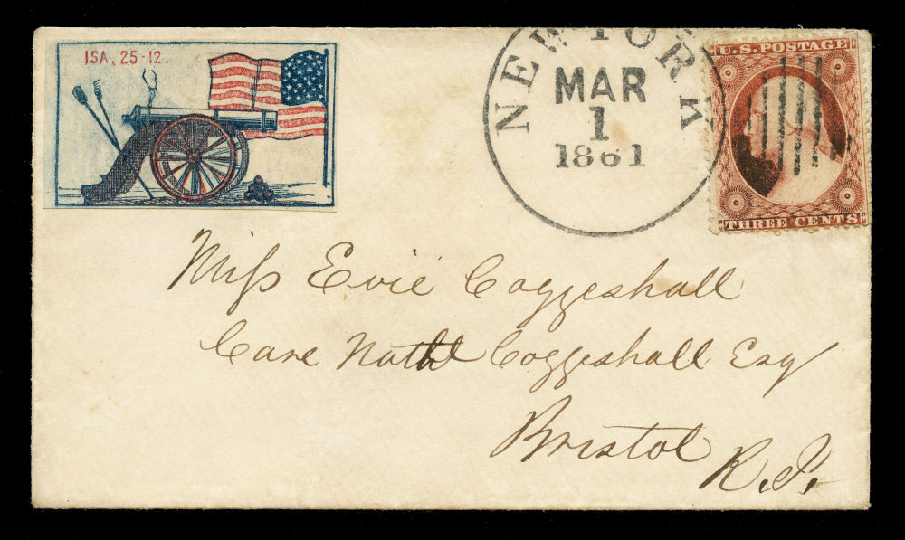 (26) 1857-61 3c dull red Washington Type III tied by bold black "New York Mar 1 1861" on cover to Bristol, Rhode Island — sent just six weeks before the outbreak of hostilities at Fort Sumter. Affixed at upper left is a vivid multicolor patriotic label featuring a cannon and American flag, one of approximately 100 known label designs produced for private patriotic use, and part of a sheet series of nine designs. This label highlights a biblical verse penned at left from Isaiah 25:12: "And the fortress of the high fort of thy walls shall he bring down, lay low, and bring to the ground, even to the dust." A scarce and evocative example of early Union patriotic sentiment expressed with a label, posted just a few days before Lincoln was inaugurated, very fine.
