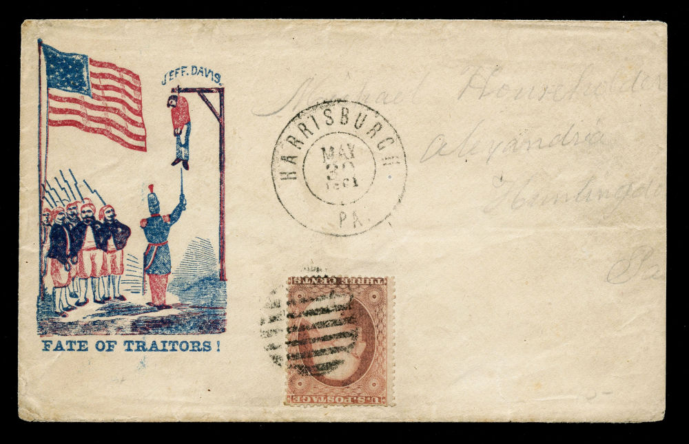 (26) 1857-61 3¢ dull red Washington Type III tied by black circular grid cancel on dramatic U.S. Civil War patriotic cover from Harrisburg to Alexandria, Pennsylvania with accompany "Harrisburg PA May 30 1861" circular datestamps at center. Patriotic imagery at left features "Fate of Traitors" below red and blue design featuring a troop of Pennsylvania Zouaves overseeing the handing of Confederate President "Jeff Davis". A very fine Union patriotic design portraying a hanging as the just price of treason especially where the Confederate President was concerned.
