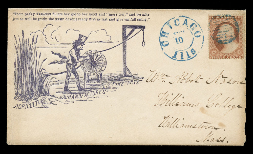 (26) 1857-61 3¢ dull red Washington Type III tied by blue circular grid cancel on ornate U.S. Civil War patriotic cover from Chicago, Illinois to Williamstown, Massachusetts with accompany blue "Chicago Ills JUL 10 (1861)" cds cancels at right. Patriotic imagery at left features the progression from "Agriculture" crops to a "Manufactures" spinning wheel with the words "Hemp for Traitors / North or South" connected to "Fine Arts" hanging gallow. Words above the design: Them pesky Treason fellers hev got to hev ROPE and "more tew," and we mite jest as well be gettin the wemp dewins ready first as last and give em full swing". A very fine Union patriotic design portraying Uncle Sam preparing the gallows rope for traitors.