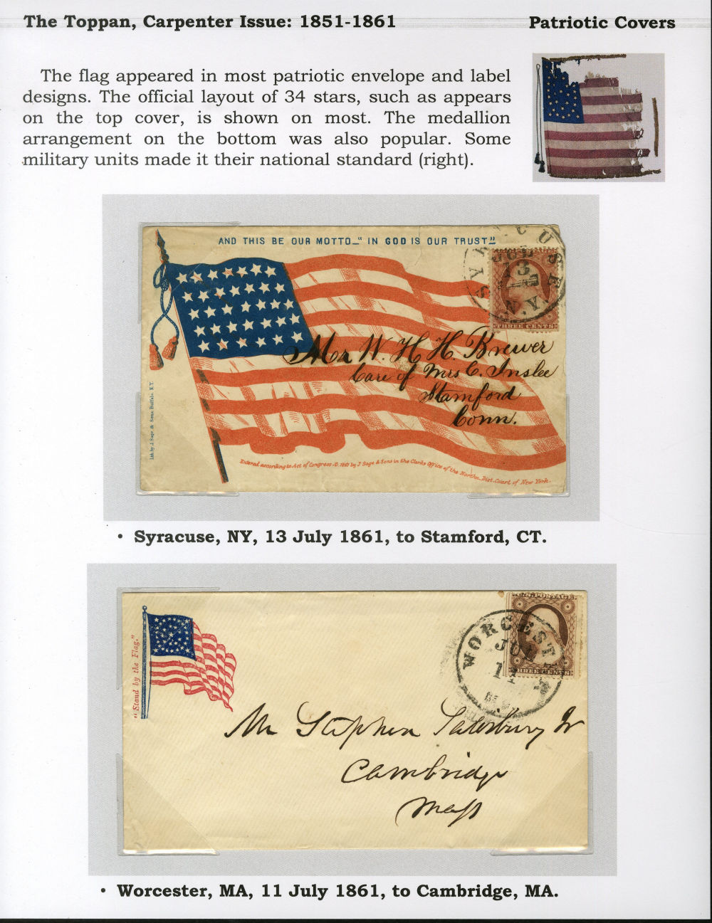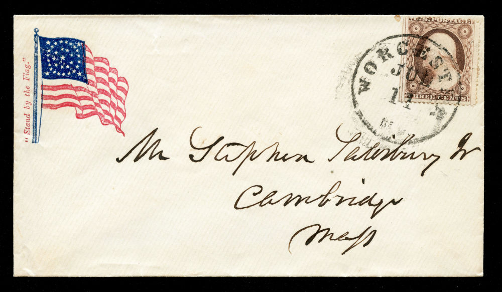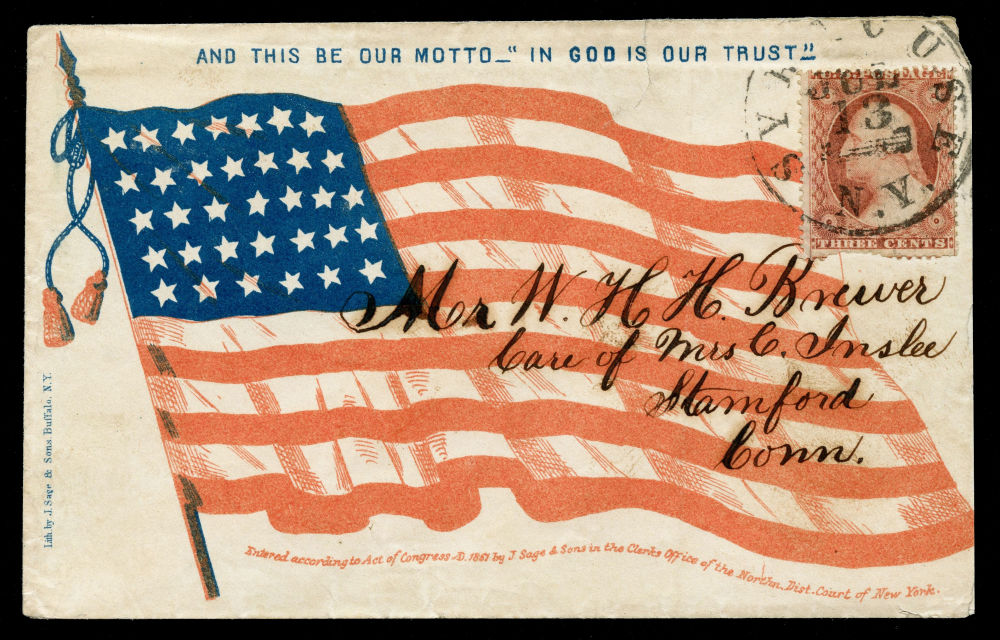 (26) Pair of U.S. Civil War patriotic covers featuring the newly updated 34-star American flag design, which officially came into effect on July 4, 1861 following Kansas's admission to the Union on January 29 of that year. Each cover is postmarked within ten days of the new flag’s official debut. The first, franked with a (26) 3¢ dull red Washington Type III is tied by a black “Syracuse N.Y. Jul 13 (1861)” circular datestamp on an all-over flag design cover sent to Stamford, Connecticut, with printed patriotic motto above: “And This Be Our Motto – In God Is Our Trust.” Slightly reduced at right from opening, ex. Walcott Collection, Lot #2843. The second cover, also bearing a (26) 3¢ dull red Washington Type III is tied by black “Worcester Mass. Jul 11 (1861)” cds on a medallion-style 34-star flag patriotic envelope inscribed “Stand By The Flag” and addressed to Cambridge, Massachusetts; the stamp includes a visible guideline at left. The 34-star arrangement was the dominant Union patriotic motif in 1861, with designs ranging from official layouts to artistic interpretations like the medallion style seen here. A very fine and historically resonant pair of early Civil War patriotic covers commemorating the arrival of the 34-star Union flag.