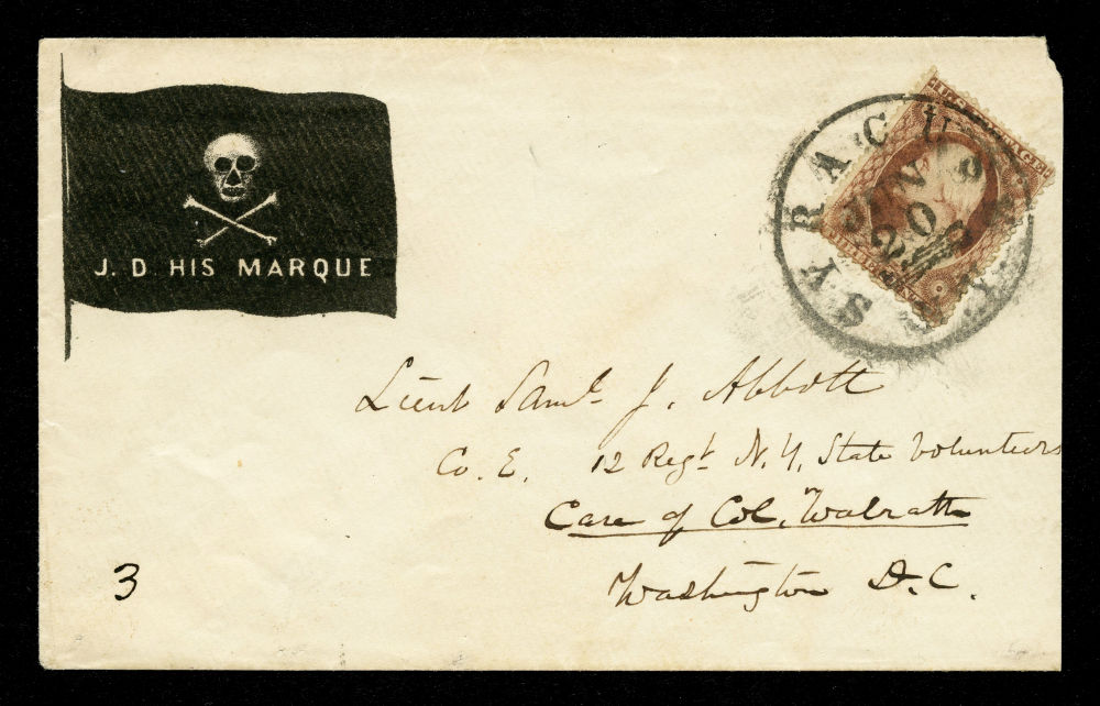 (26) 1857–61 3¢ dull red Washington Type III used by black cds on desirable Civil War patriotic cover from Syracuse, New York to Washington, D.C., dated 20 June 1861, bold Syracuse cds partially ties the stamp at upper right. The dramatic black-and-white patriotic vignette at top left features a black pirate-style flag emblazoned with a skull and crossbones above the inscription “J. D. His Marque,” a pointed reference to Confederate President Jefferson Davis. Addressed to Lieutenant Abbott of the 12th New York Volunteer Infantry, which had been mustered into service just weeks earlier on 8 May 1861. A powerful early Civil War usage of this dramatic Union patriotic design, very fine.
