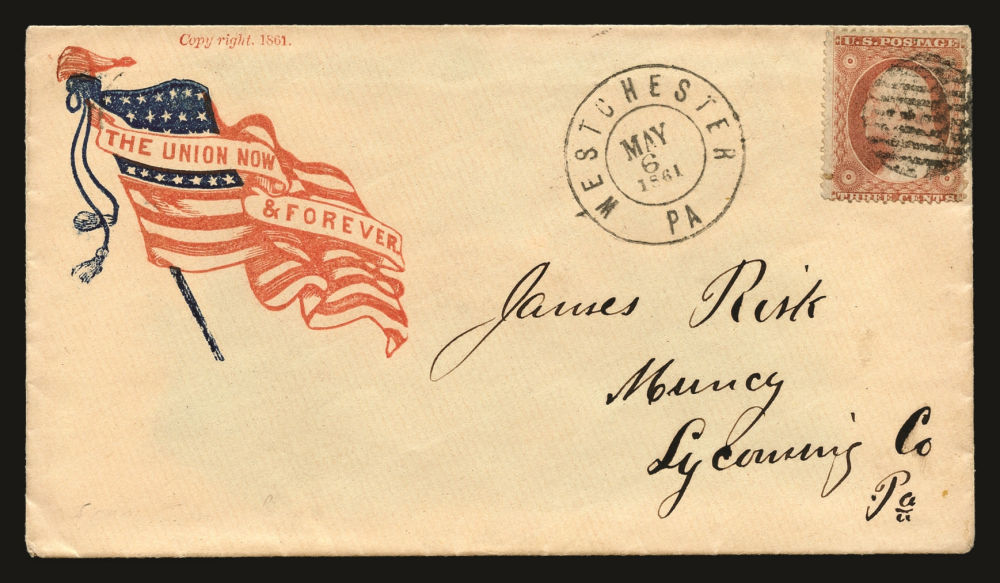 (26) 3¢ dull red Washington Type III tied by bold “Westchester Pa. May 6 1861” cds on striking red and blue patriotic cover featuring waving American flag with ribbon reading “The Union Now & Forever”, addressed to James Risk in Muncy, Lycoming County, Pennsylvania.