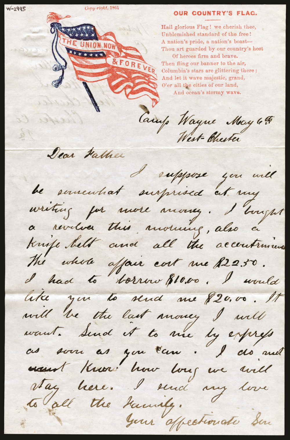 Accompanied by the original matching patriotic lettersheet bearing the same flag design and full printed poem titled Our Country’s Flag. The letter, written from “Camp Wayne, May 6th, West Chester,” vividly reflects the early days of the Civil War and the youthful enthusiasm of Union soldiers and officers. The sender writes his father requesting funds for a recently purchased revolver, knife belt, and other accoutrements totaling $12.50—adding that he had to borrow $10.00 and asks for $2.00 more, to be sent by express.