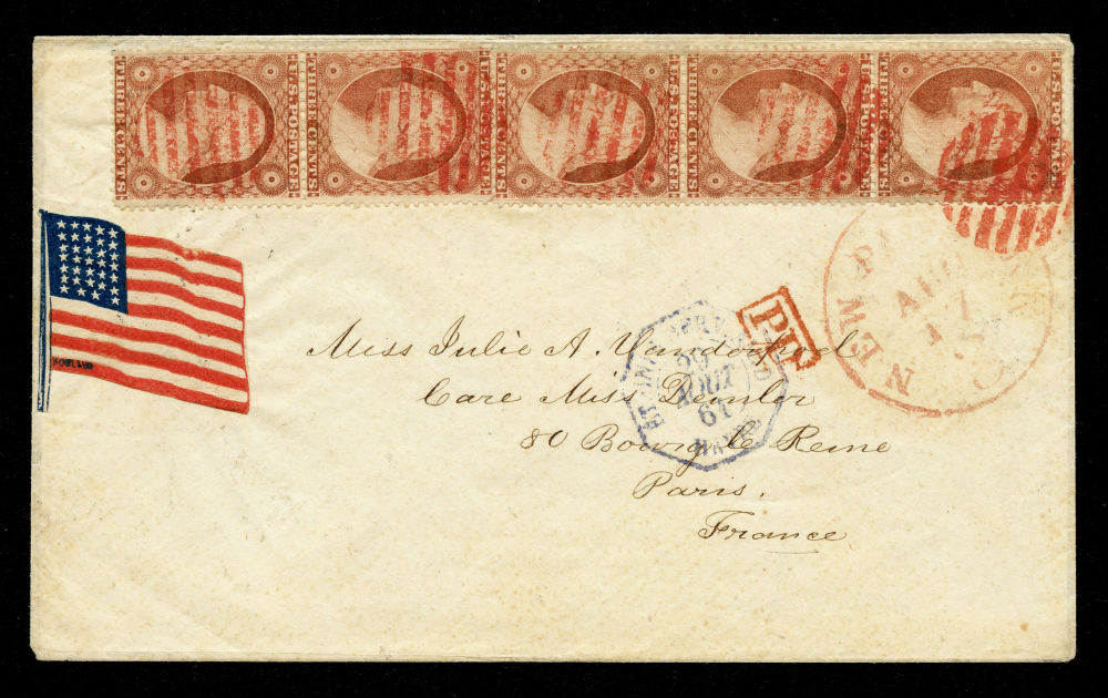 (26) 1857-61 3¢ dull red Washington Type III stamps arranged as a horizontal strip of three and a horizontal pair, used by red grid cancels on cover from New York to Paris. Red "New York Am. Pkt. Aug 17" (1861) exchange office cds and red boxed "P.D." handstamp at center. Blue French transit datestamp, “Et Unis Serv. Br. A. C. 29 Aout 61,” indicating entry to France via British packet on August 29. Striking red, white and blue patriotic design of 34-star U.S. flag label at upper left.