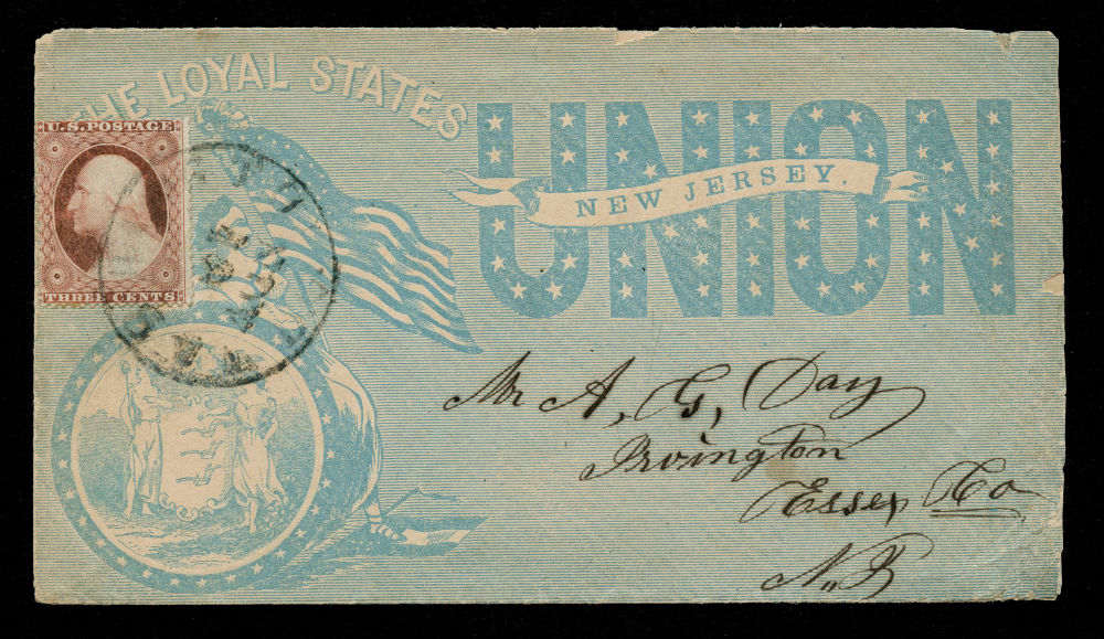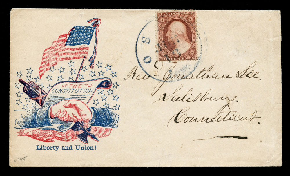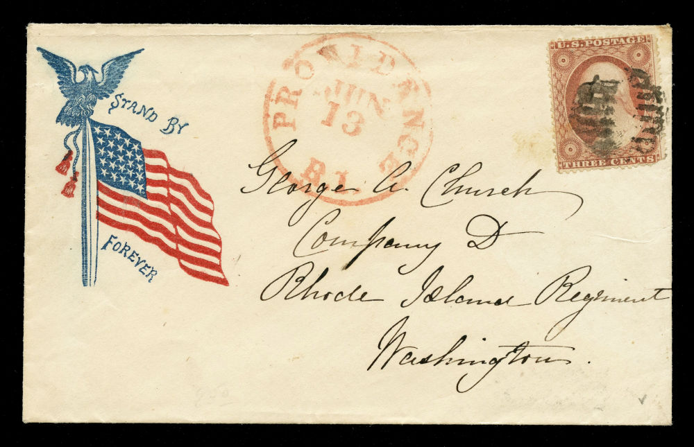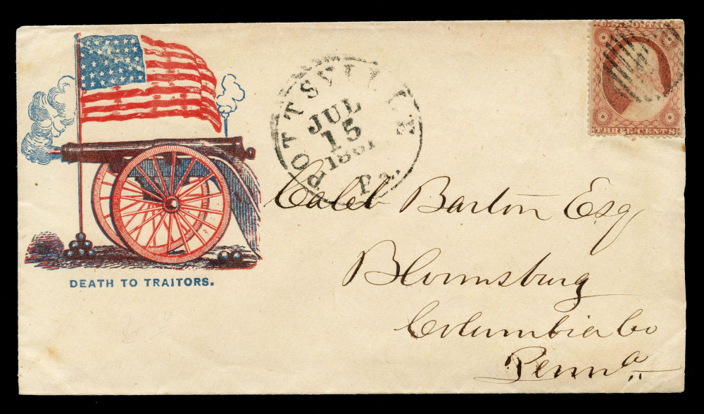 Group of four Union patriotic covers, each bearing a (26) 1857–61 3¢ Issue stamp showcasing vivid Union-themed designs mailed during the early months of the Civil War including Washington, DC to Irvington, NJ popular “Loyal States” patriotic series cover, Providence, RI to Washington, DC – 13 June 1861, addressed to a soldier in the Rhode Island Regiment shortly after the April 1861 call for troops, with bold red and blue eagle and flag design inscribed “Stand by Forever”, Osage, IA to Salisbury, CT sent 13 June 1861, with dramatic “Liberty and Union!” design showing clasped hands beneath the Constitution and U.S. flag, and Pottsville, PA to Bloomsburg, PA sent on 15 July 1861, with cannon and flag design and the resolute motto “Death to Traitors.” Few cover edgewear faults, though overall a fine and interesting group of Civil War patriotic covers, each representing the intense symbolism and pride that accompanied the Union war effort.