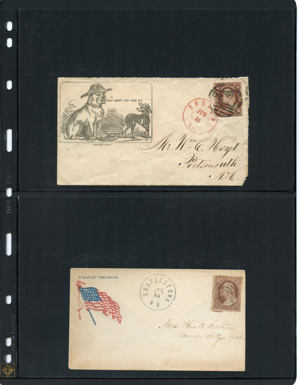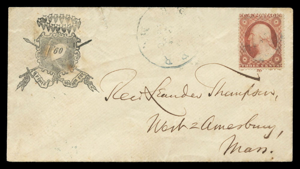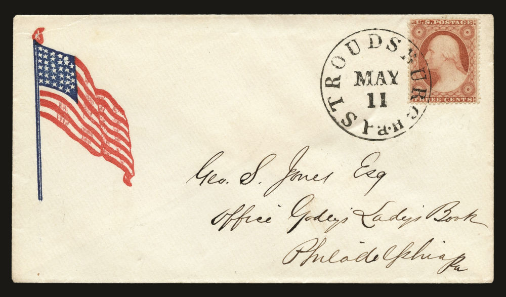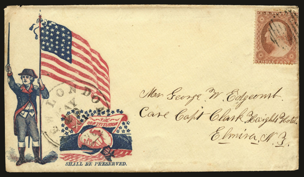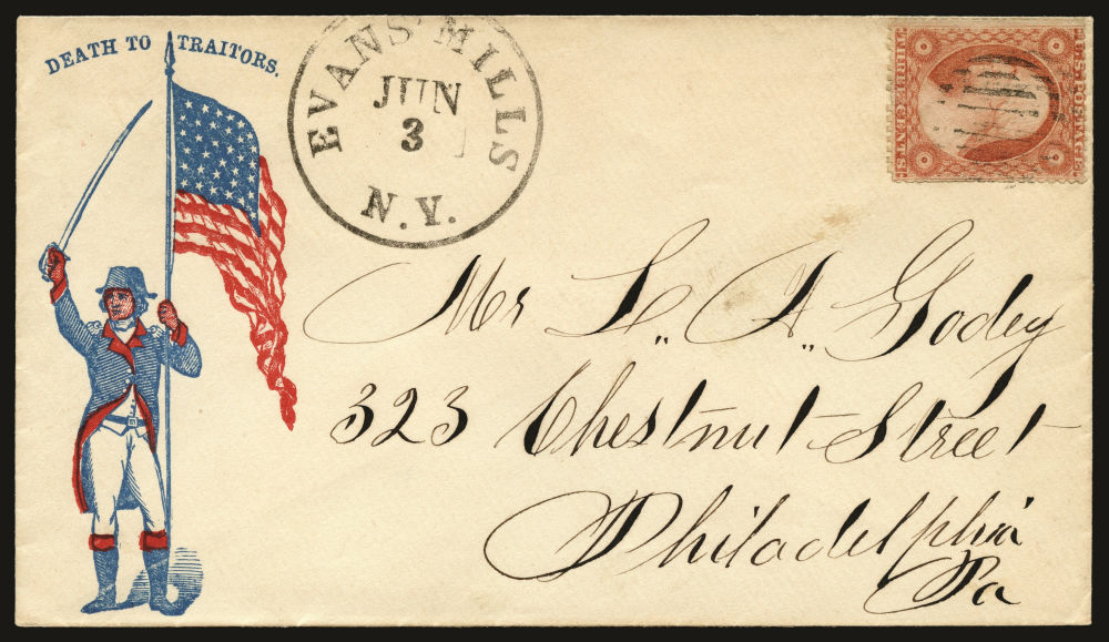 Group of eleven covers each franked by a (26) 1857-61 3¢ dull red Washington Type III stamp and bearing a Union patriotic design. This compelling ensemble highlights a wide range of themes, including military, allegorical, and satirical illustrations supporting the Union cause. Notable examples include a Zouave soldier under a "Washington via Baltimore" sign (Salisbury Centre, NY), a vivid red design titled “Agriculture, Manufactures, Fine Arts” showing a Union figure spinning rope for a traitor’s gallows (Weston, VA.), a multicolor eagle and shield design from Lewistown, Pa, a cover with a patriotic woman holding a flag and a Boston-origin cartoon cover titled “Why Don’t You Take It?” featuring dogs labeled “Scott” growling at a dog with a Confederate flag. Additional covers bear flags, eagles, and slogans such as “Stand by the Union” (Charlestown, NH) and “Union Forever” (Plainfield, NJ). Several of the covers were sent right up to and beyond the mid-August demonetization of the 1857-61 Issue. A rich and diverse representation of Civil War-era patriotic stationery, small faults to covers and their stamps here and there but overall, fine.