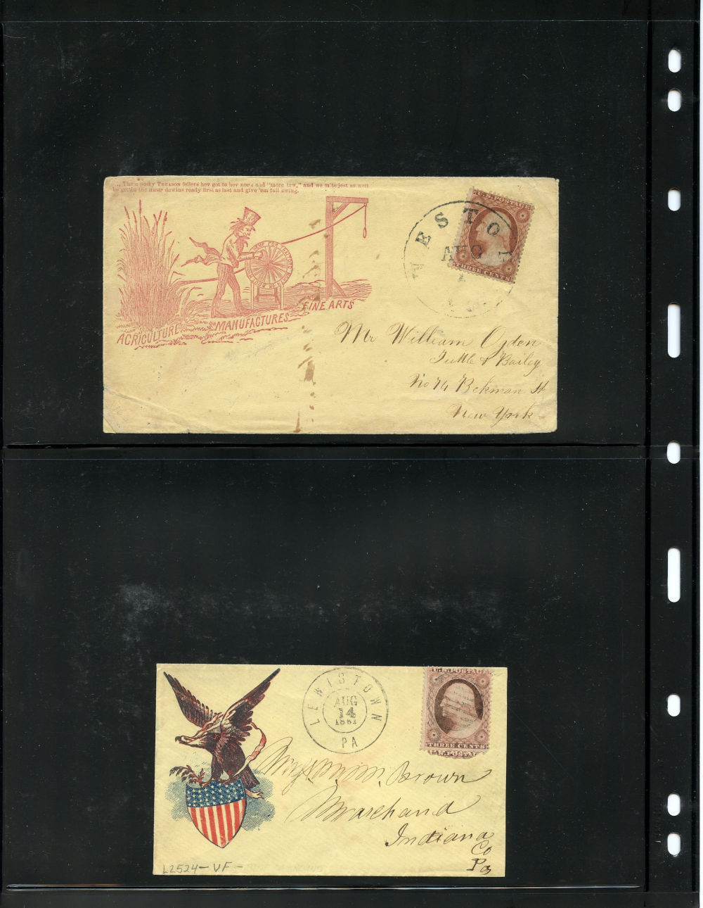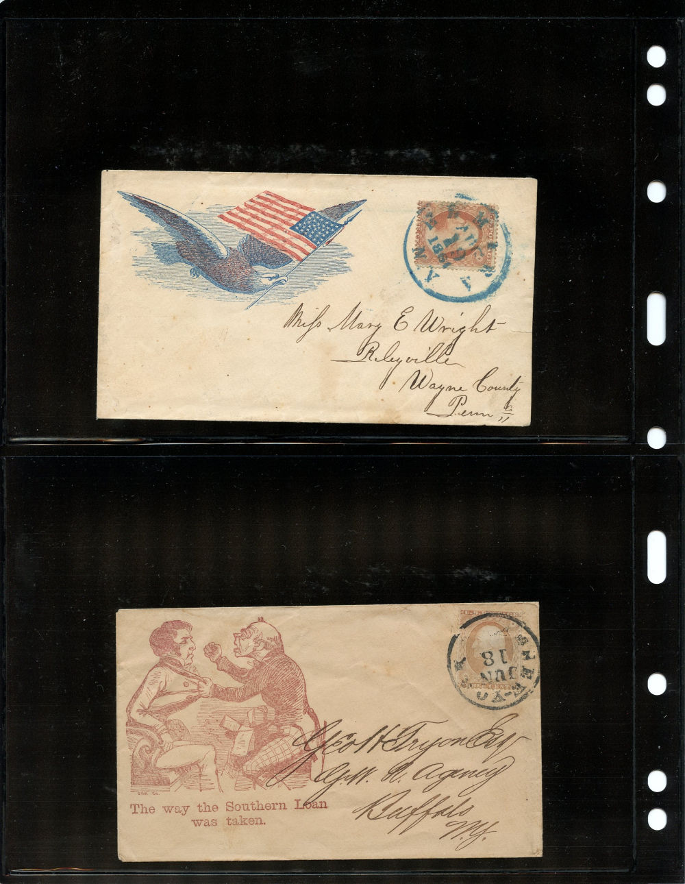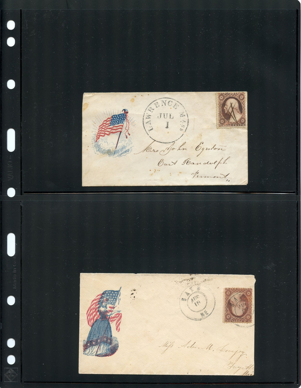 Group of eleven covers each franked by a (26) 1857-61 3¢ dull red Washington Type III stamp and bearing a Union patriotic design. This compelling ensemble highlights a wide range of themes, including military, allegorical, and satirical illustrations supporting the Union cause. Notable examples include a Zouave soldier under a "Washington via Baltimore" sign (Salisbury Centre, NY), a vivid red design titled “Agriculture, Manufactures, Fine Arts” showing a Union figure spinning rope for a traitor’s gallows (Weston, VA.), a multicolor eagle and shield design from Lewistown, Pa, a cover with a patriotic woman holding a flag and a Boston-origin cartoon cover titled “Why Don’t You Take It?” featuring dogs labeled “Scott” growling at a dog with a Confederate flag. Additional covers bear flags, eagles, and slogans such as “Stand by the Union” (Charlestown, NH) and “Union Forever” (Plainfield, NJ). Several of the covers were sent right up to and beyond the mid-August demonetization of the 1857-61 Issue. A rich and diverse representation of Civil War-era patriotic stationery, small faults to covers and their stamps here and there but overall, fine.