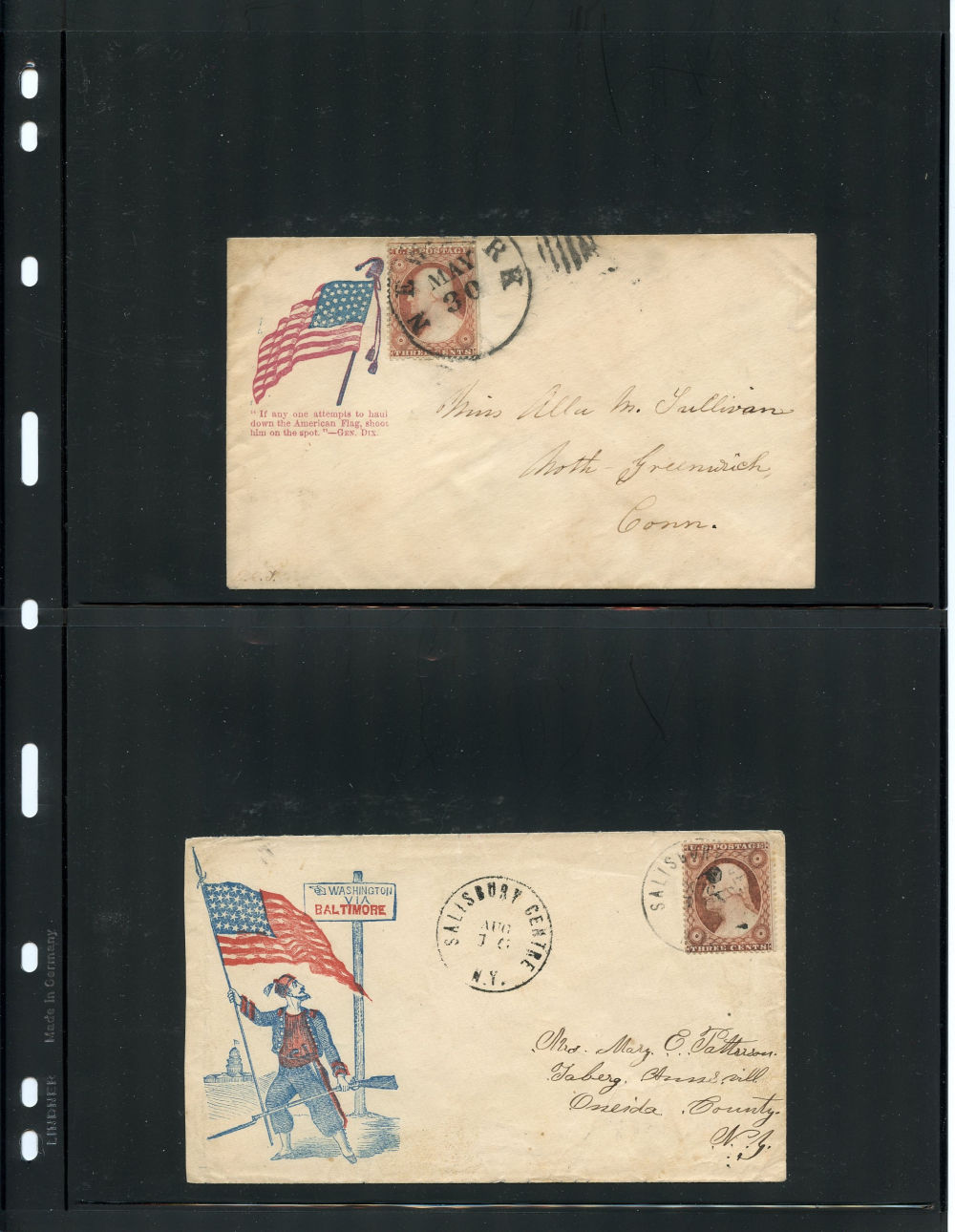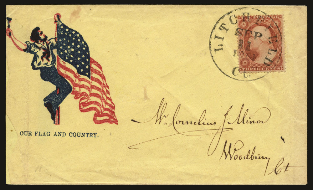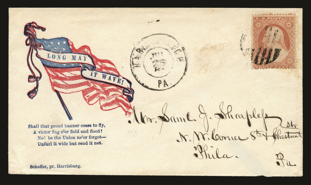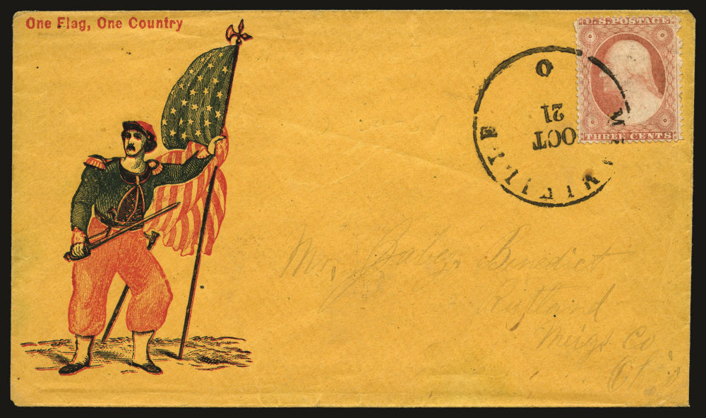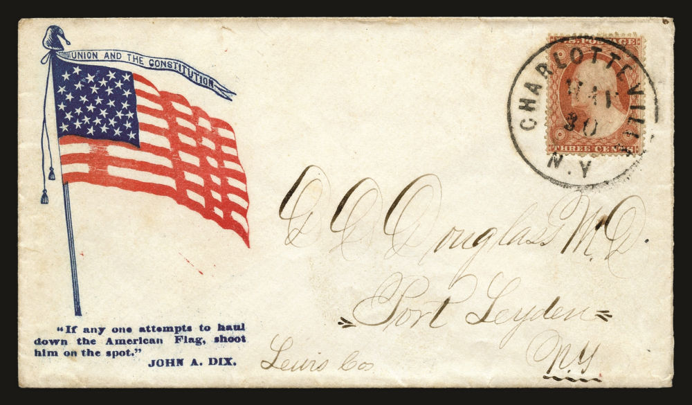 Attractive group of American Civil War Union patriotic covers showcasing the 33 and 34-star American flag across a variety of designs and sentiments with six bearing (26) 1857-61 3¢ Washington Type IV stamps and one with a (26A) Type III stamp used by a combination of black grid and cds cancels. The covers include all-over flag designs and illustrated vignettes—many with accompanying slogans—such as “Death to Traitors,” “Our Flag and Country” used from Litchfield, CT with Sc. 26A, and “Long May It Wave.” One cover features John A. Dix’s famous warning: “If anyone attempts to haul down the American flag, shoot him on the spot,” while another bears a poetic pledge to never forget the Union “until it fade but rend it not.” Finally, a boldly uniformed Zouave soldier holding a sword and U.S. flag, with “One Flag, One Country” printed at top right—especially colorful and visually dramatic. Origins include Michigan, Ohio, Pennsylvania, Connecticut and New York, small faults here and there but overall a fine-v.f. selection, ideal for display and further expansion, presenting a rich and patriotic cross-section of Civil War illustrated envelopes.
