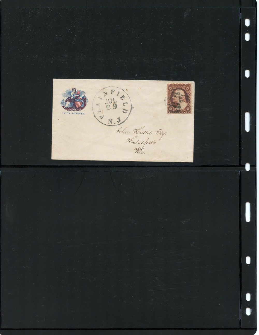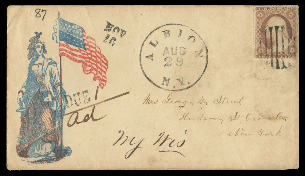 (26) 3¢ dull red Washington Type III tied by black grid cancel on illustrated patriotic cover featuring red and blue Liberty & Flag design at left. Large “Albion NY Aug 29 (1861)” cds at center and matching “DUE 1” with manuscript “Ad” marking at left. Sent to Hudson, incorrectly designated as New York when the recipient was potentially in Hudson, Wisconsin. A late use of the 1857-61 stamp being sent after the demonetization in mid-August. Scruffs on front and tears at bottom of reverse flap.