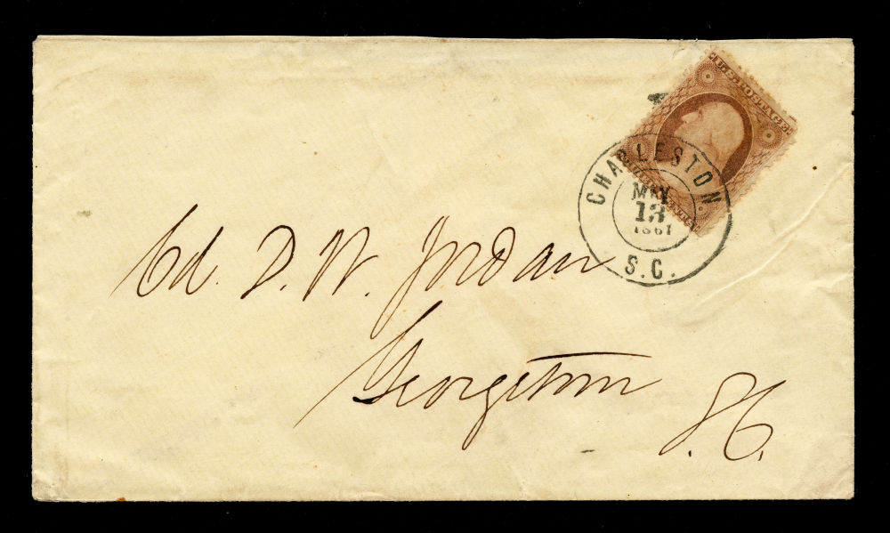 (26) 1857-61 3¢ dull red Washington Type III tied by clear “Charleston S.C. May 13, 1861” cds on cover to Col. D. W. Jordan in Georgetown, South Carolina. Mailed just weeks after the outbreak of the Civil War, this cover represents one of the final uses of U.S. postage in the seceded South before the Confederate postal system began operations on June 1, 1861. Cover missing backflap and small piece out of stamp likely from original separation, otherwise fine.