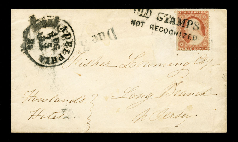 (26) 1857-61 3¢ dull red Washington Type III tied by crisp strike of the rare “OLD STAMPS / NOT RECOGNIZED” two-line handstamp on cover from Philadelphia to Long Branch, New Jersey, with matching "Philadelphia Pa. Aug 15 (1861)" cds and "DUE 3" rating handstamp at upper left. The stamp shows minor tears at upper right and left center, barely visible and not detracting from the overall very vine appearance of this example of the demonetization period in the early months of the Civil War. This cover was sent just two days after Philadelphia’s strict August 13 deadline for accepting 1857 Issue stamps and embossed envelopes. While the new 1861 adhesive stamps had not yet arrived in Philadelphia (not available until August 19), the Post Office nevertheless enforced the demonetization deadline, marking this example with the distinctive “OLD STAMPS NOT RECOGNIZED” handstamp. It is especially scarce when the marking ties the stamp to the cover as is the case here. With 1990 Professional Stamp Experts and 1993 Philatelic Foundation certificates, cat. value $12,500.