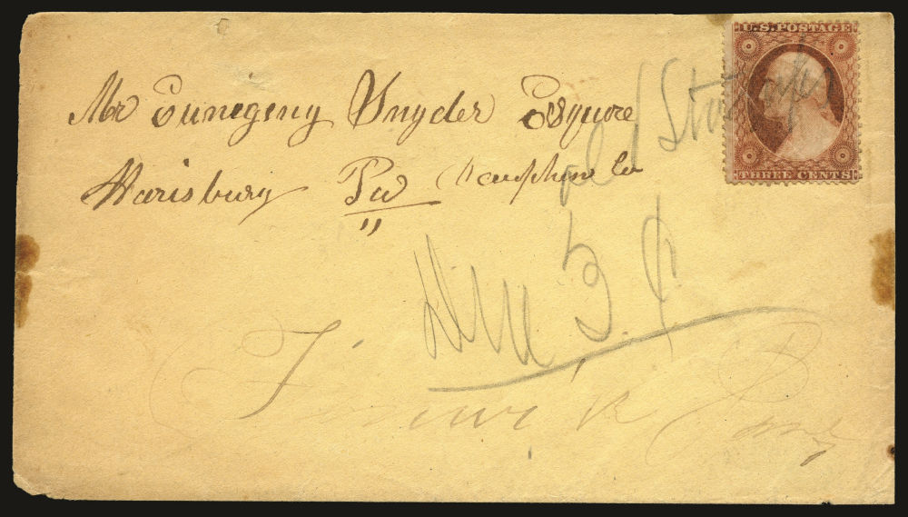 (26) 1857-61 3¢ dull red Washington Type II tied to cover by manuscript “Old Stamps” addressed to Harrisburg, Pennsylvania, bearing additional manuscript pencil “Due 3” notation at center. Undated but clearly posted after the August 1861 demonetization of the 1851–61 Issue stamps, this letter likely originated from a small post office that had not yet been supplied with new stamps or lacked official handstamps to mark invalid postage. The stamp has a diagonal crease ending in a long tear, cover with edge stains but still an evocative example of transitional Civil War–era postal history showing local improvisation in response to evolving postal regulations and supply constraints.