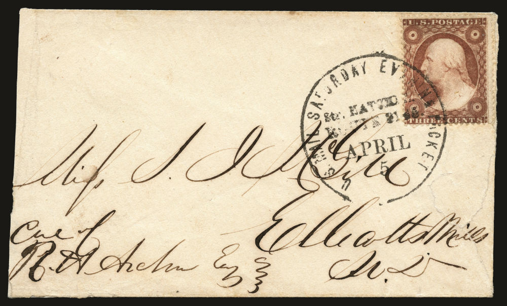 (26) 1857–61 3¢ Washington Type III tied by bold black route agent marking reading “U.S. Mail Saturday Evening Packet, Str. Natchez Route 8165 April 5” on cover to Maryland. Despite tears at lower right and along the back, and reduction at left, the cover remains a fine appearing and desirable example of this scarce Mississippi River steamboat postmark, fine.With 2008 Philatelic Foundation certificate.