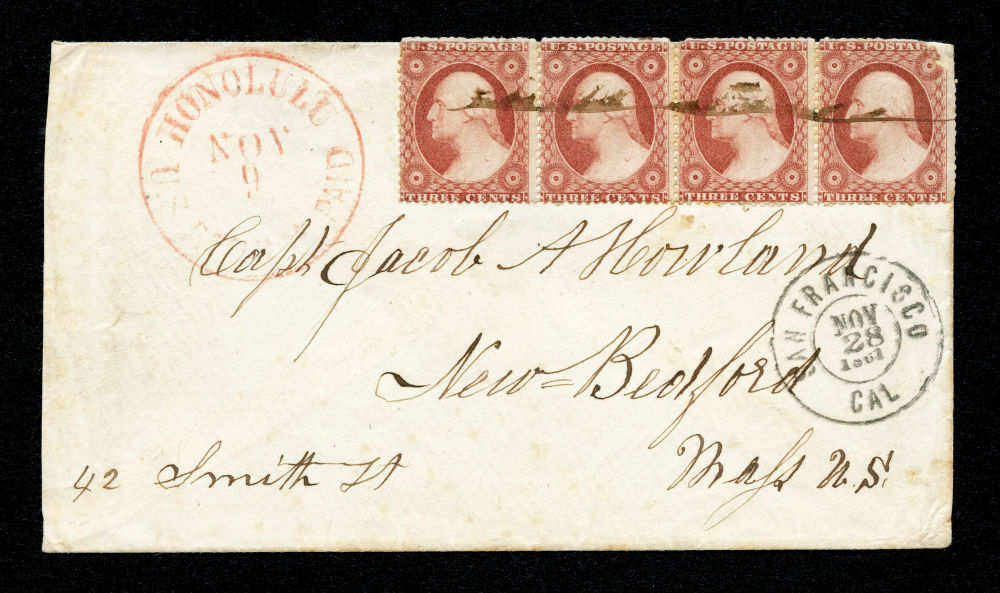 (26) 1857-61 3¢ dull red Washington Type II horizontal strip of four tied by pen cancels on cover sent from Honolulu, Hawaii and addressed to Capt. Jacob A. Howland at 42 Smith Street in New Bedford, Massachusetts. Red “U.S. Postage Paid / Honolulu, Hawaiian Islands / Nov 9” cds at upper left and black “San Francisco Cal / Nov 28 1861” transit cds at lower right. The reverse bears a New Bedford Dec. 28 arrival backstamp. This usage represents the 10¢ transcontinental rate from the West Coast to the East Coast, plus the additional 2¢ ship captain's fee required under the U.S.-Hawaiian postal arrangement.