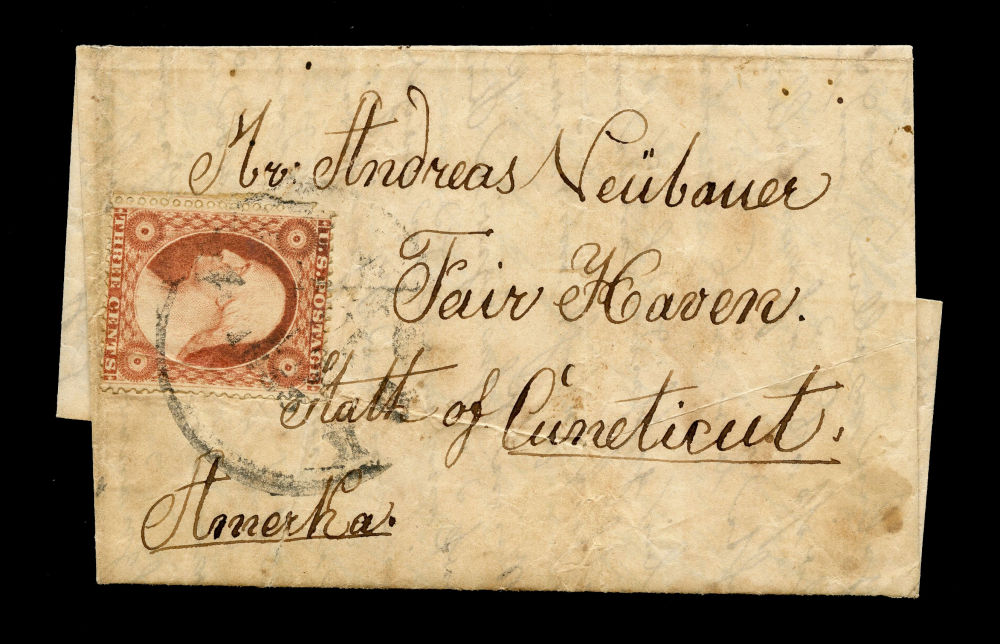 (26) 1857-61 3¢ dull red Washington Type II tied by black New York cds on April 25, 1858-dated folded letter addressed to Andreas Neubauer in New Haven, Connecticut and carried privately from Bischwind, Bavaria and entered the U.S. mails in New York, where postage was applied and canceled, likely on or around May 15, 1858. The cover and the stamp both creased diagonally, cover with some additional age toning. No foreign postage markings or transit handstamps are present, consistent with privately carried mail inserted directly into the U.S. postal system—commonly referred to as a “bootleg” cover.
