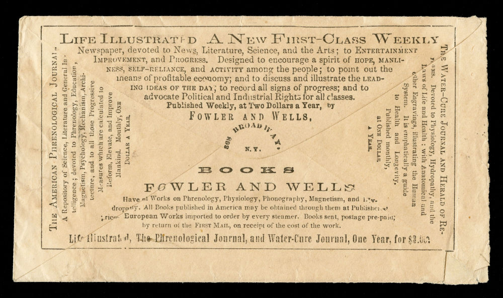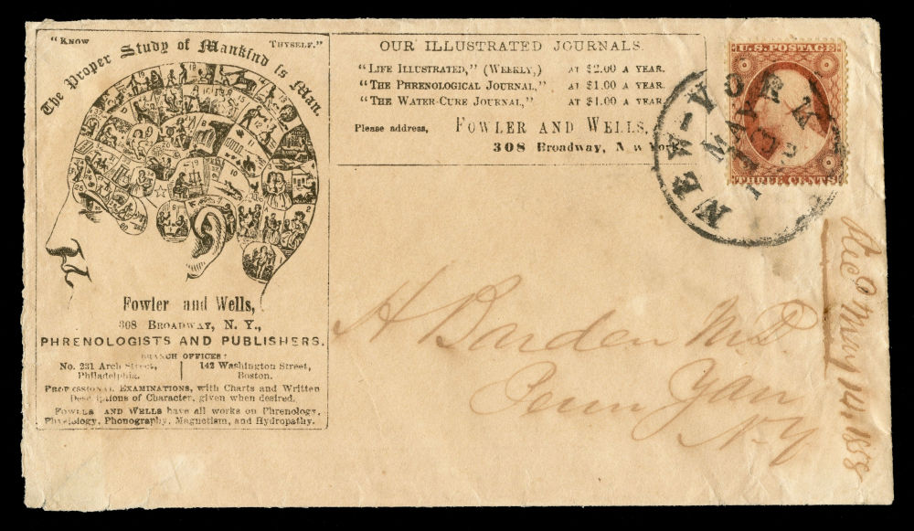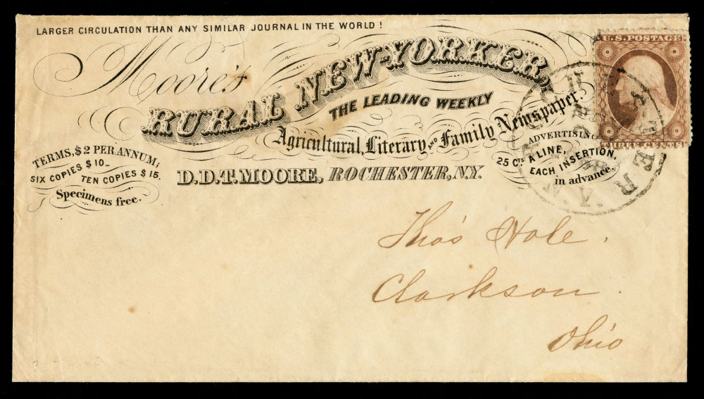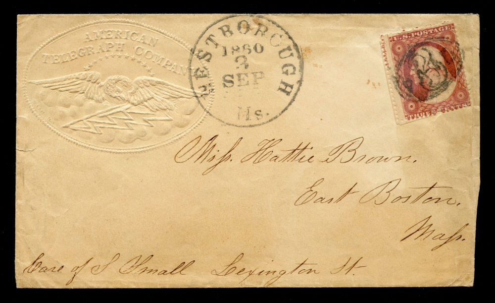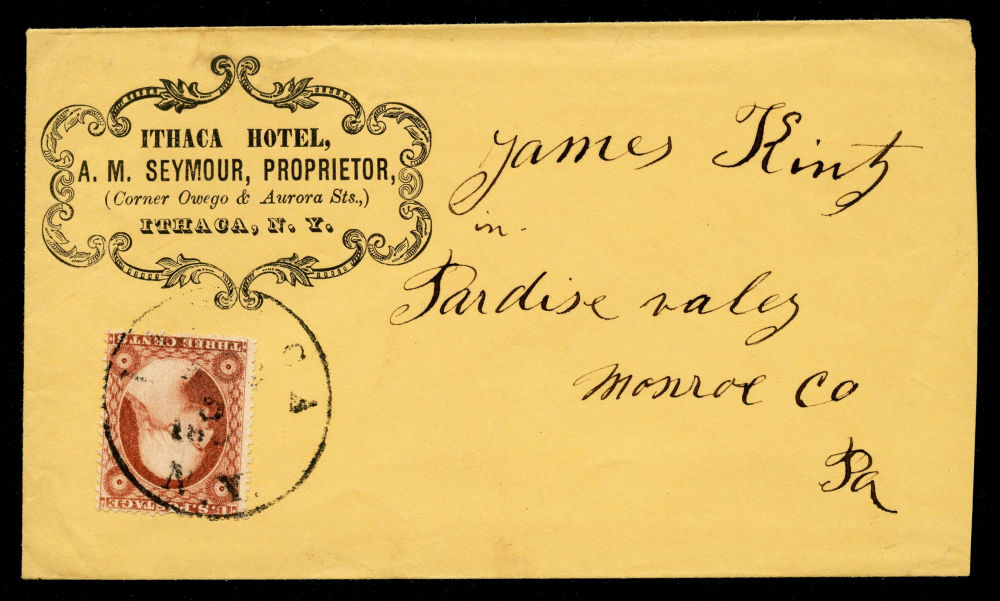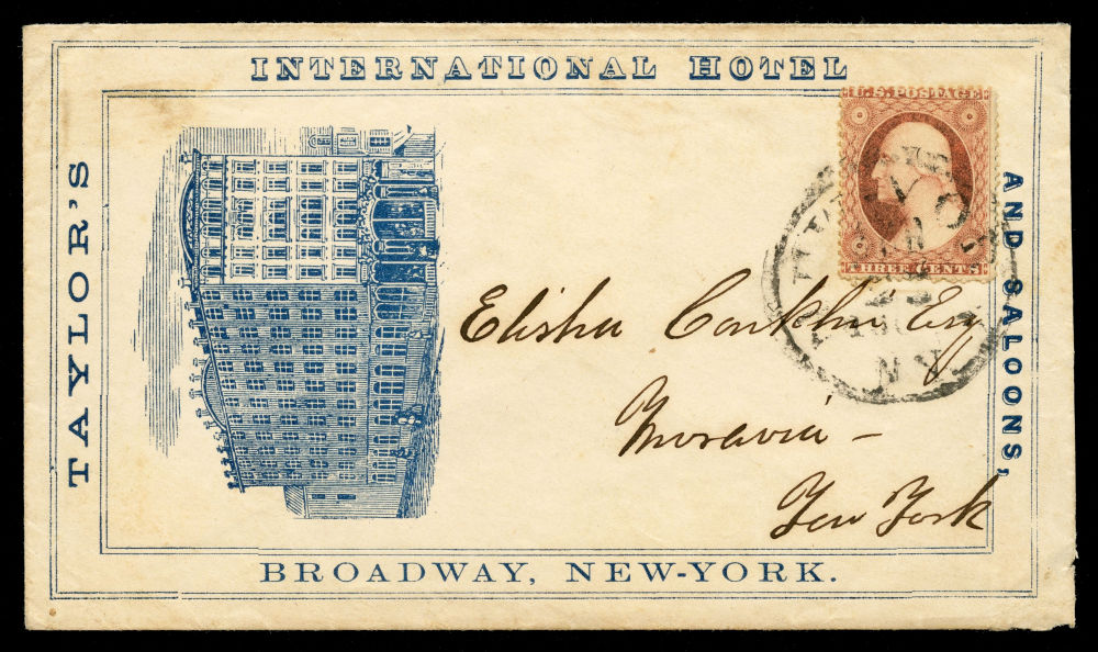 Group of seven covers bearing 1857–61 3¢ Issue stamps, mounted on exhibit pages and reflecting diverse and appealing uses of the 3¢ Washington stamp during the final years before the outbreak of the Civil War. The group includes two illustrated hotel advertising covers: one from Taylor's International House and Saloons in New York and another from the Ithaca Hotel. Additional covers include the imprint of Fowler & Wells, Phrenologists and Publishers of New York, the "Rural New-Yorker" newspaper and a striking religiously themed cover sent in the tense months before the Civil War. It bears the Latin phrase “Finis non dum est” ("The end is not yet")—a reference to Matthew 24:6—and alludes to impending national conflict. Final items include a “WAY” handstamp cancel on a New Orleans-bound cover, and a 3¢ Washington showing part imprint at left, tied by a bold fancy “3” cancel on an embossed American Telegraph Company envelope with the original telegraph message enclosed. Faults to be expected but overall fine-v.f.