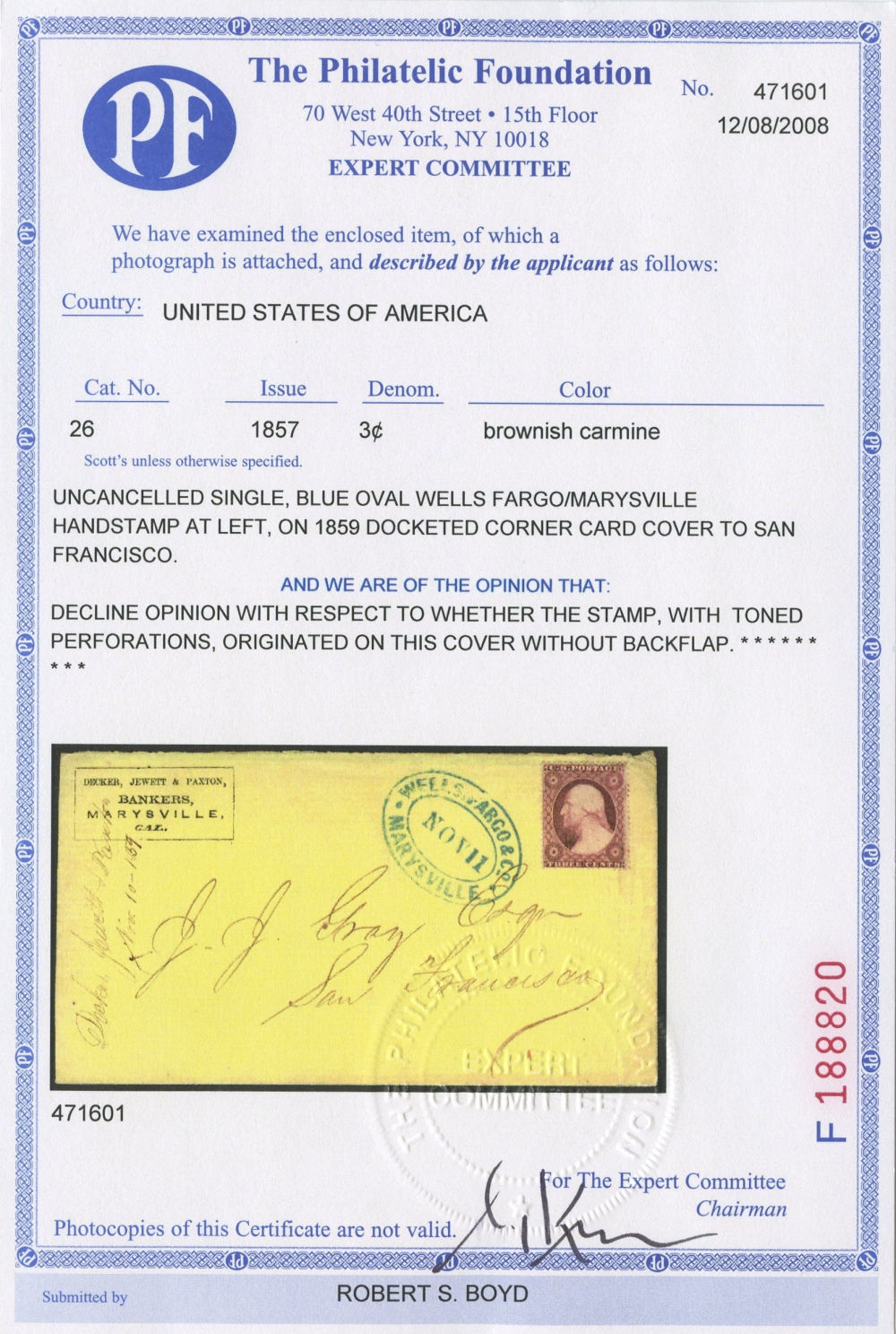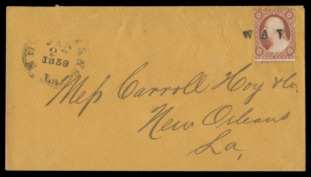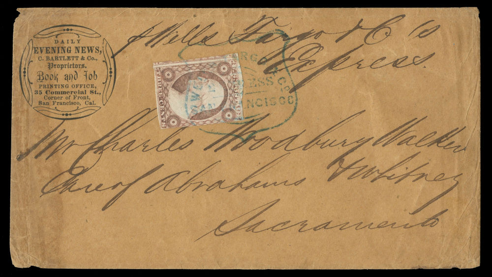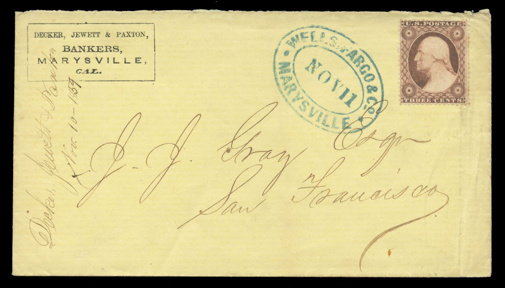 (26) 3¢ dull red Washington Type III uncancelled with toned perforations on yellow cover with blue “Wells, Fargo & Co. Marysville, Nov 11” double oval handstamp at upper right, addressed to San Francisco. Bold printed corner card for Decker, Jewett & Paxton, Bankers, Marysville, docketed at origin “Nov. 10–1859” at left. A fine cover overall, though the 2008 Philatelic Foundation certificate declined opinion on whether the 3¢ stamp originated. Still presents well as an express usage with clear Wells Fargo handling.