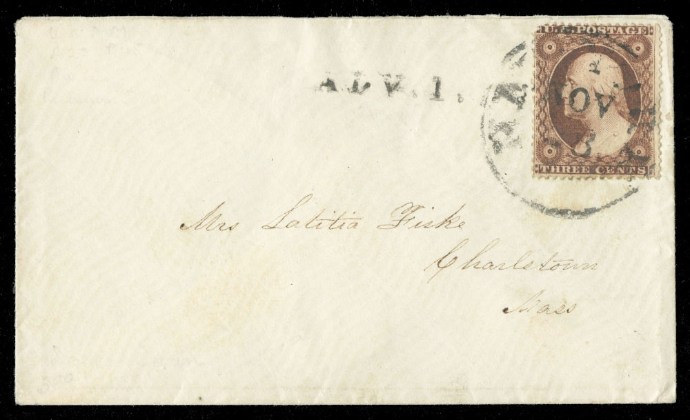 (26) 3¢ deep rose brown Washington Type III tied by indistinct town cds on cover addressed to Mrs. Letitia Fiske, Charlestown, Mass. Bold black “ADV. 1.” handstamp at top, indicating the letter was advertised after failing to be collected. Fine and clean example showing the added 1¢ fee required for advertised letters in offices meeting the $1,000 revenue threshold.