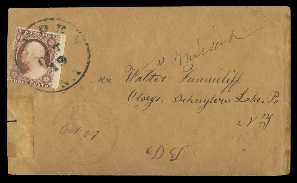 (25) 3¢ dull red Washington Type I tied by black "Oct 19 Dryden, N.Y." cds on buff envelope misdirected to Otisco, N.Y., before reaching Otsego and the intended recipient Walter Tunnicliff. Clear manuscript “Missent” and no added fee, as the error was made by the post office department. Repaired tear on reverse and edge damage at bottom left.
