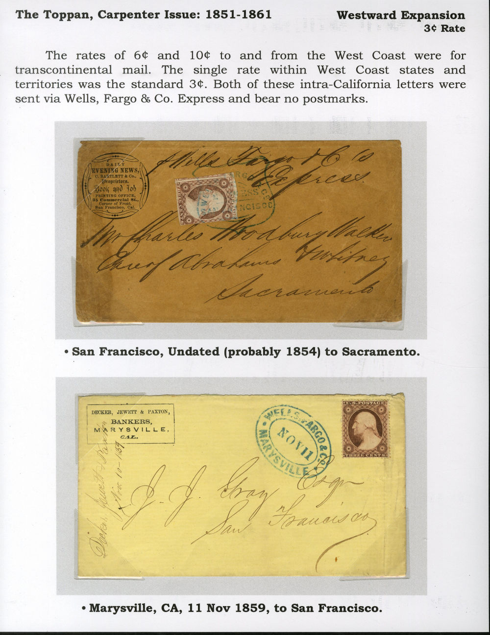 A compelling intra-California express pair mounted on exhibit page—one fully tied and dated, the other showing fine strike and business correspondence context—highlighting West Coast commercial mail handled by Wells Fargo during the gold rush era and before completion of the transcontinental railroad.
