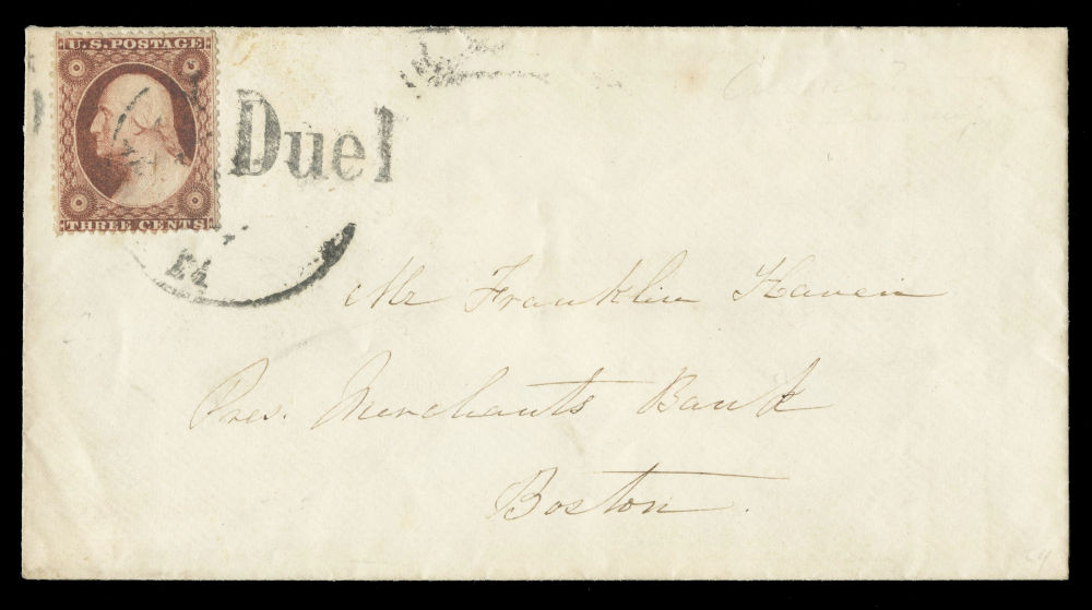 (26) 3¢ dull red Washington Type III tied by partial cds on cover addressed to the President of Merchants Bank in Boston.” Prominently struck black “Due 1” handstamp to right of stamp, likely indicating 1¢ due for local delivery.