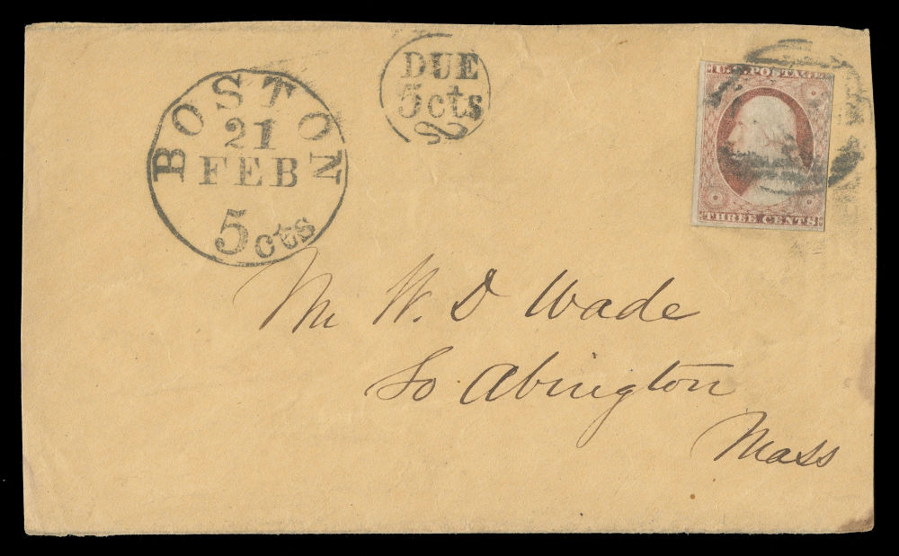 (11A) 3¢ dull red Washington Type II tied by "PAID" in grid cancel with large “BOSTON 21 Feb 5cts” datestamp and matching “DUE 5cts” marking at left. This letter likely exceeded the ½ oz. weight limit, requiring a double-rate charge. As the sender only affixed a single 3¢ stamp, the addressee was charged 5¢ total—3¢ regular postage plus a 2¢ penalty.