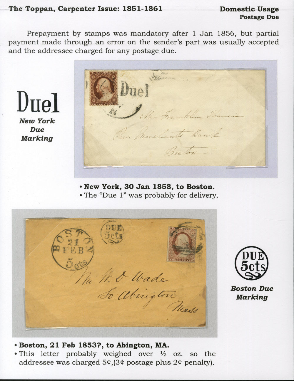 A fine and instructive pair of early postage due covers mounted on exhibit page, illustrating two different circumstances under which additional fees were assessed and collected from recipients under the evolving U.S. postal regulations of the 1850s.