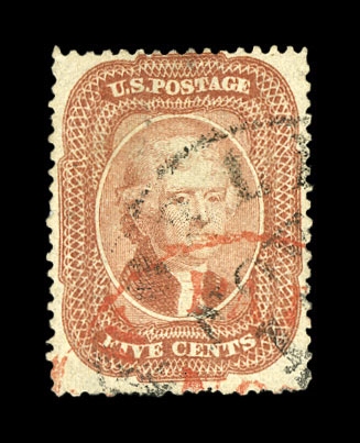 (27) 1857-61 5¢ brick red Jefferson Type I used with partial black cds and red transit cancels, tiny thin at top and a tiny diagonal crease at bottom right with some short perfs at bottom noted, still fine appearance overall.