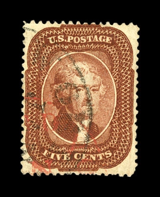 (28) 1857-61 5¢ red brown Jefferson Type I used with partial black cds and red cancels. Some short perfs at bottom, but they don't detract from the overall deep color and f-v.f. centering.