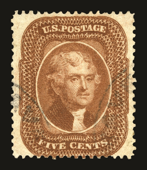 (30) 1857-61 5¢ orange brown Jefferson Type II used with unobtrusive partial black cds cancel and fine-v.f. centering.
