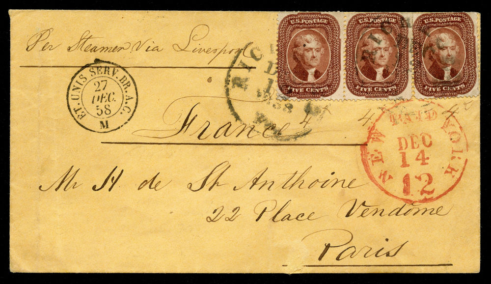 (28) 5¢ red brown Jefferson Type I horizontal strip of three with deep rich color, tied by black “Richmond, Va Dec 12 1858” cds on cover addressed to Paris. Perfs at top of stamps cut potentially at time of use. Red "New-York Paid 12 Dec 14" (1858) exchange office CDS at right along with French entry marking "Et Unis Serv. Br. A. C. 27 Dec 58" at upper left, indicating British packet entry into France and finally a black circular Jan 30 Paris receiver backstamp. Manuscript directive at top left reads "Per Steamer via Liverpool."