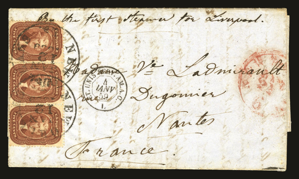 (28A) 1857-61 5¢ Indian red Jefferson Type I used horizontal strip of three with clipped perfs at bottom of left two stamps, tied to folded letter with "New Orleans La. Jan. 12, 1859" cds cancels sent to Nantes, France. Manuscript instructions at top - "By the first steamer for Liverpool" along with red New York credit and French transit datestamps on front. "Paris A Bordeaux" and Nantes transit backstamps on reverse.