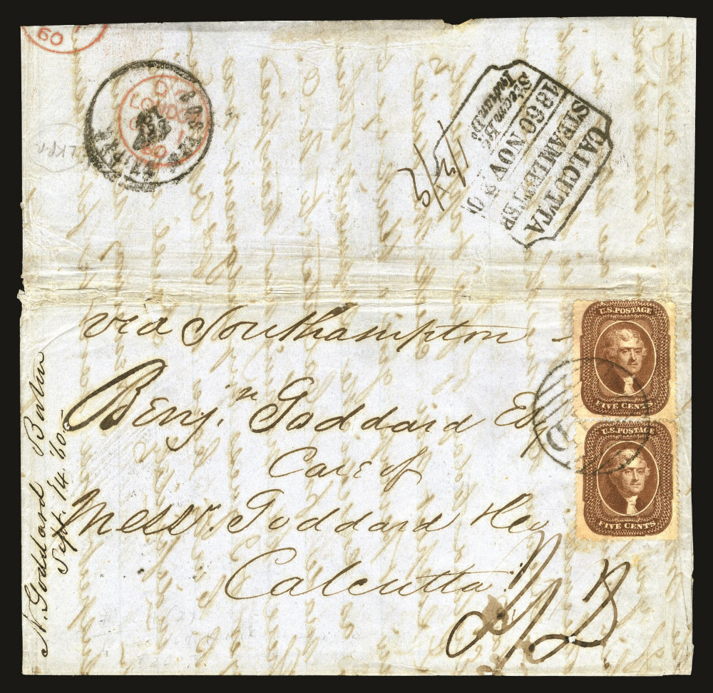 (29) 1857-61 5¢ brown Jefferson Type I vertical pair tied by large black "PAID" in grid cancels on 1860 folded letter from Boston to Calcutta, India, sent by merchant Nathaniel Goddard to his brother Benjamin Goddard. Manuscript docketing at left reads "N. Goddard Boston Sept 14 '60", with matching Boston British Packet circular datestamp on reverse. The pair prepaid the 10¢ U.S. portion of the double 33¢ transatlantic rate to India under the 1848 U.S.–Great Britain Convention. The remainder of the rate—56¢ (2s2d British or 1 rupee/2 annas/9 pies Indian)—was collected on delivery.