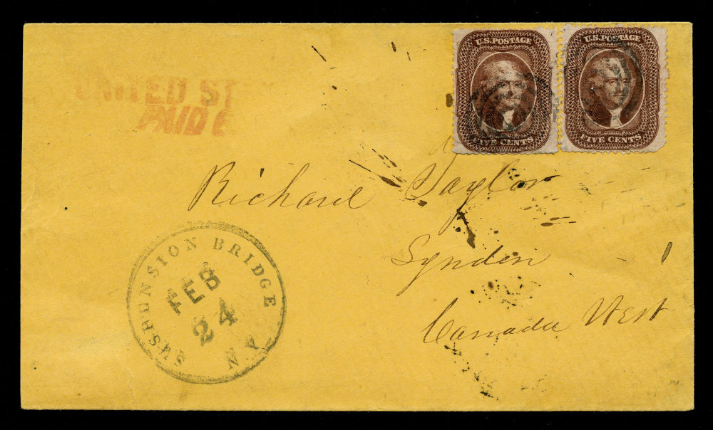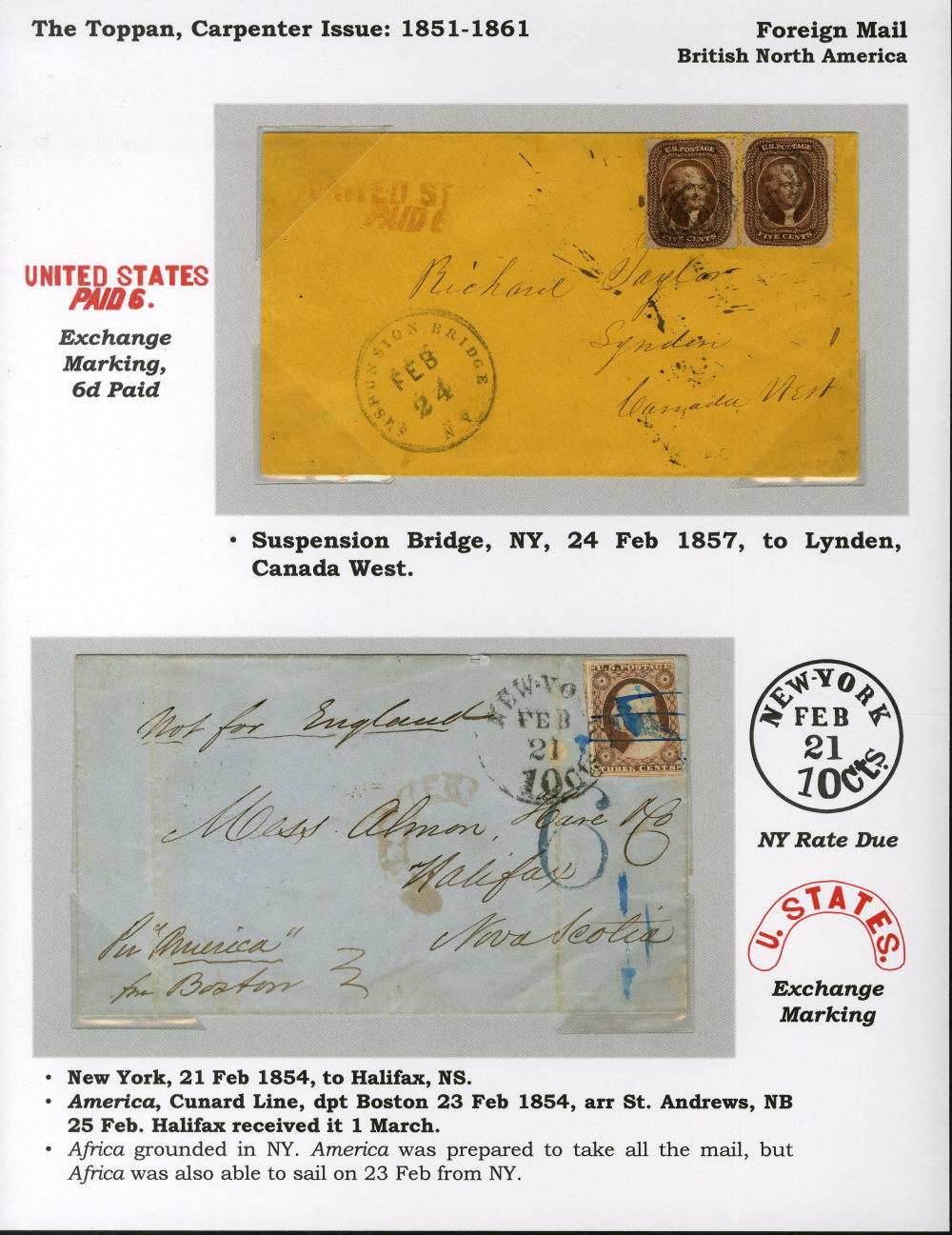 Pair of U.S. covers to British North America illustrating contrasting prepayment practices for mid-19th century trans-border mail. The first, sent from Suspension Bridge, N.Y. to Lynden, Canada West, is franked with two (30A) 1857-61 5¢ orange brown Jefferson Type II singles, each tied by black target cancels with a matching February 24 cds. A bold red "UNITED STATES / PAID 6" exchange handstamp confirms full prepayment to destination under the U.S.–Canada postal convention, with three backstamps on reverse including Canadian transit and receiving marks. One stamp shows a small piece missing at lower right, likely from pre-use separation. The second cover, from New York to Halifax, Nova Scotia, bears a (11A) 1851-57 3¢ dull red Washington Type II tied by blue pen cancel and matching “New-York 10 cts. Feb 21” (1854) circular datestamp. Red “U. STATES” exchange handstamp and manuscript “6” pence due marking reflect unpaid postage at destination. Sender’s manuscript notations at top and bottom—“Not for England” and “Per ‘America’ from Boston”—identify intended routing by Cunard Line. Backstamped at St. Andrews, N.B. on February 25 and Halifax on March 1. A fine and educational pair of covers mounted on exhibit page documenting both fully prepaid and postage-due arrangements in U.S.–Canada postal exchange during the pre-1860 treaty era.