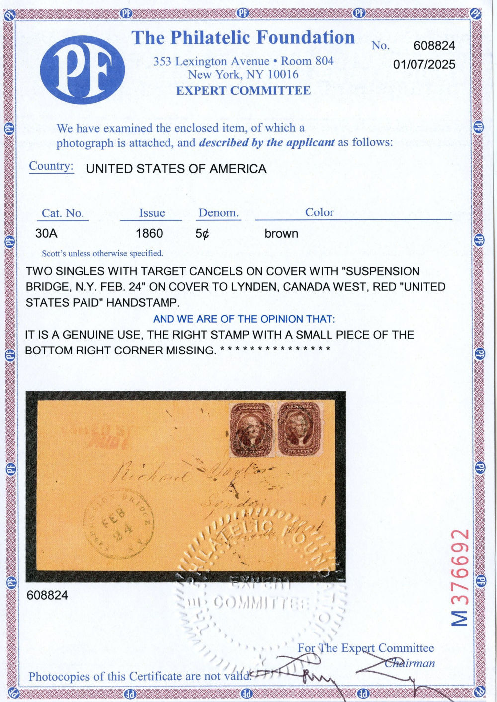 With 2025 Philatelic Foundation certificate for Sc. 30A cover.