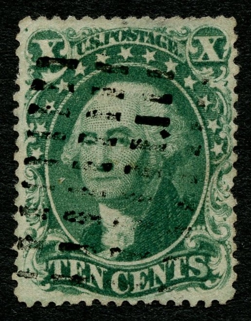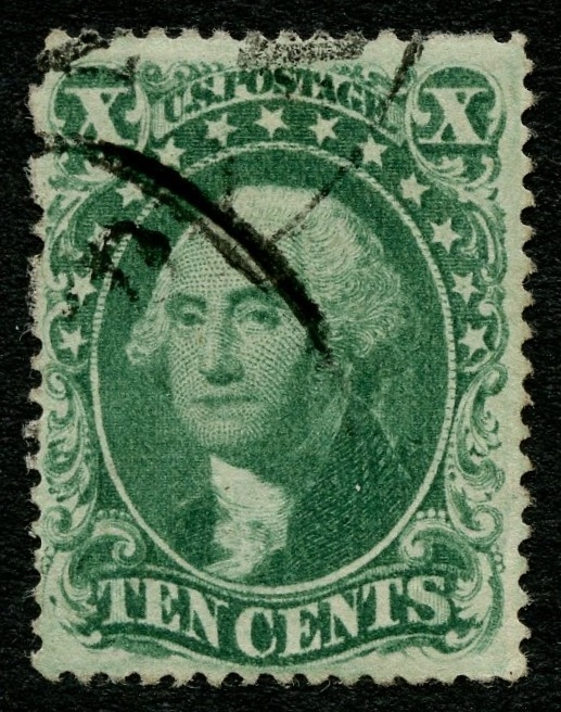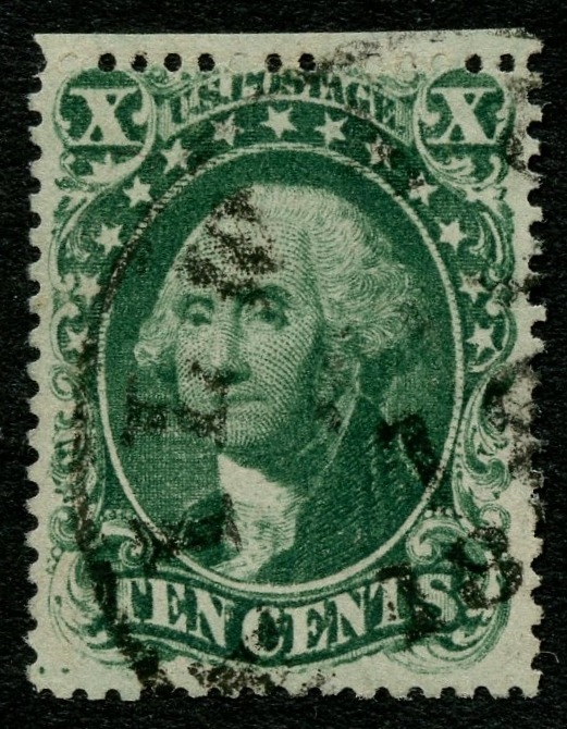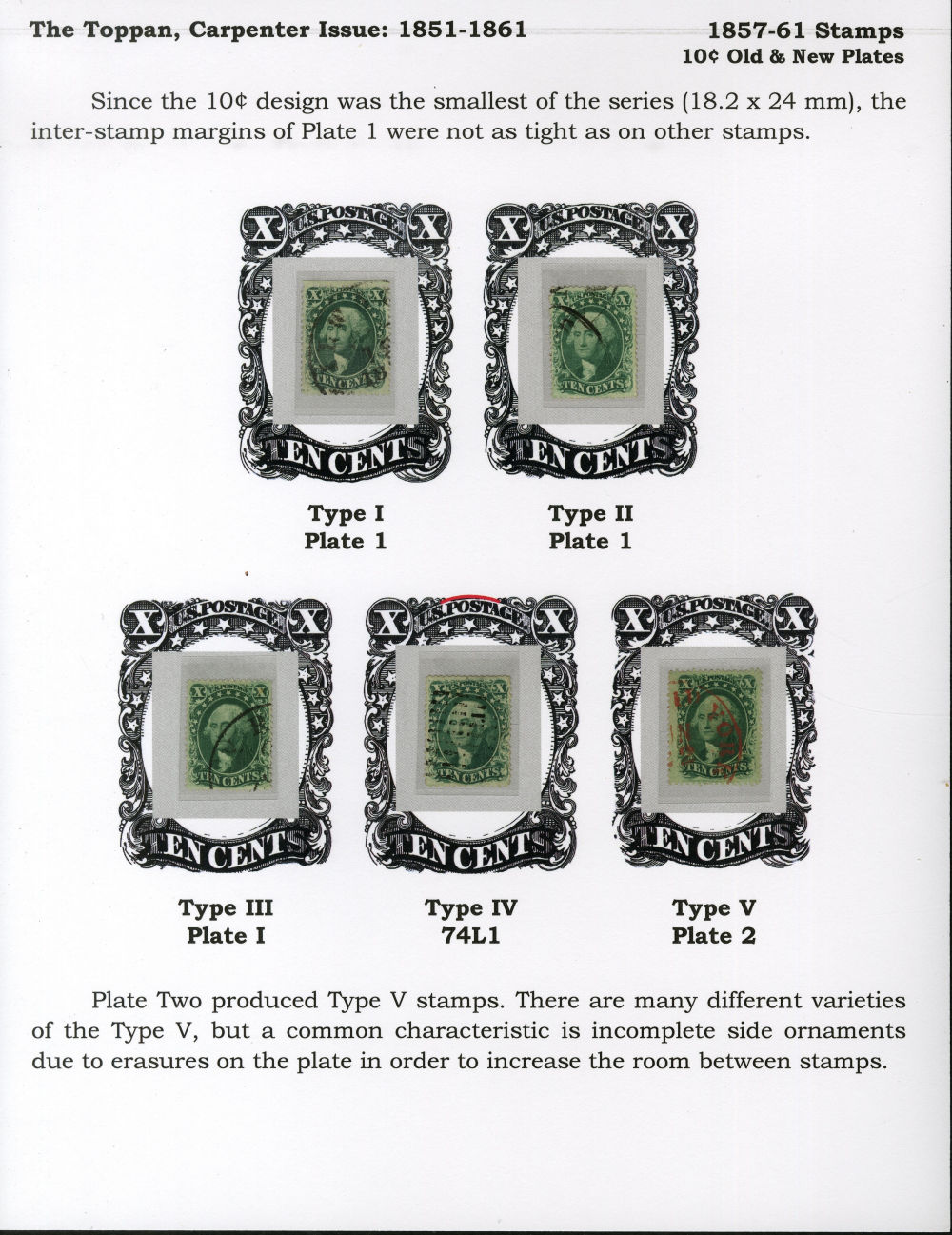 (31/35) 1857-61 10¢ green Washington Type I, II, III, IV & V used representing a complete set of the 1857-61 Issue perforated types mounted on an exhibit page. The Type I, II & III are each used by a partial black cds cancel, the Type IV with black grid cancel and the Type V with a sharp red partial New York cds. A small pulled perf at right of the Type IV is noted, otherwise a fine-v.f. group. Cat. value $3,892.50.