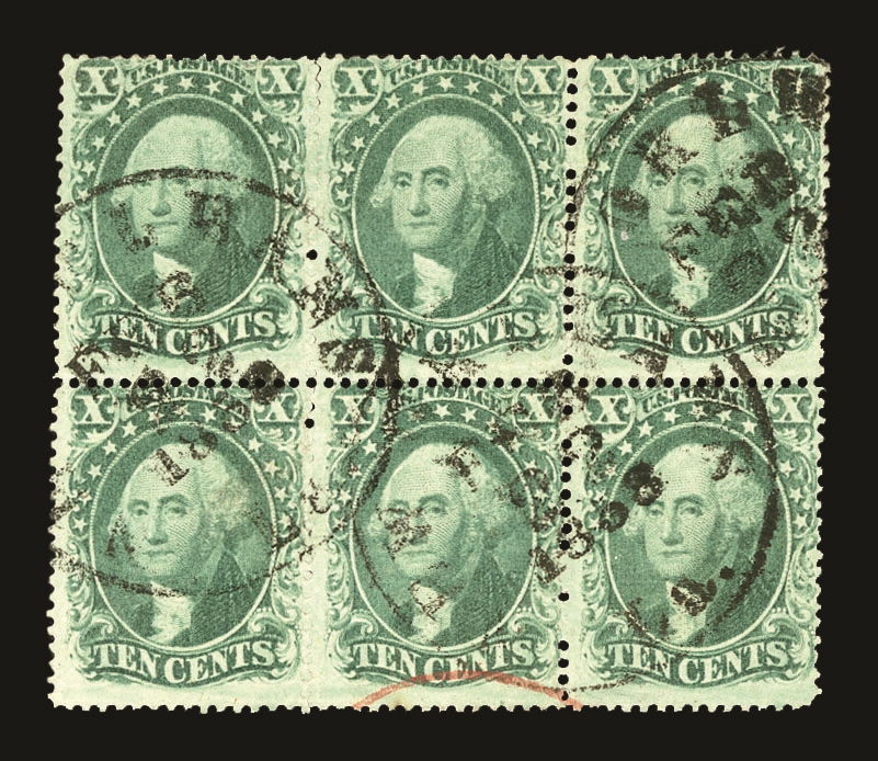(32/33) 1857-61 10¢ green Washington Type II/III, positions 1-3L1/11-13L1, including misplaced transfer combination used block of six with three Type III (33) stamps on the top and three Type II (32) stamps on the bottom. A fine multiple of the 1857-61 10¢ stamps in sound condition, used by black circular date stamp cancels and a small portion of a red transit marking at bottom.