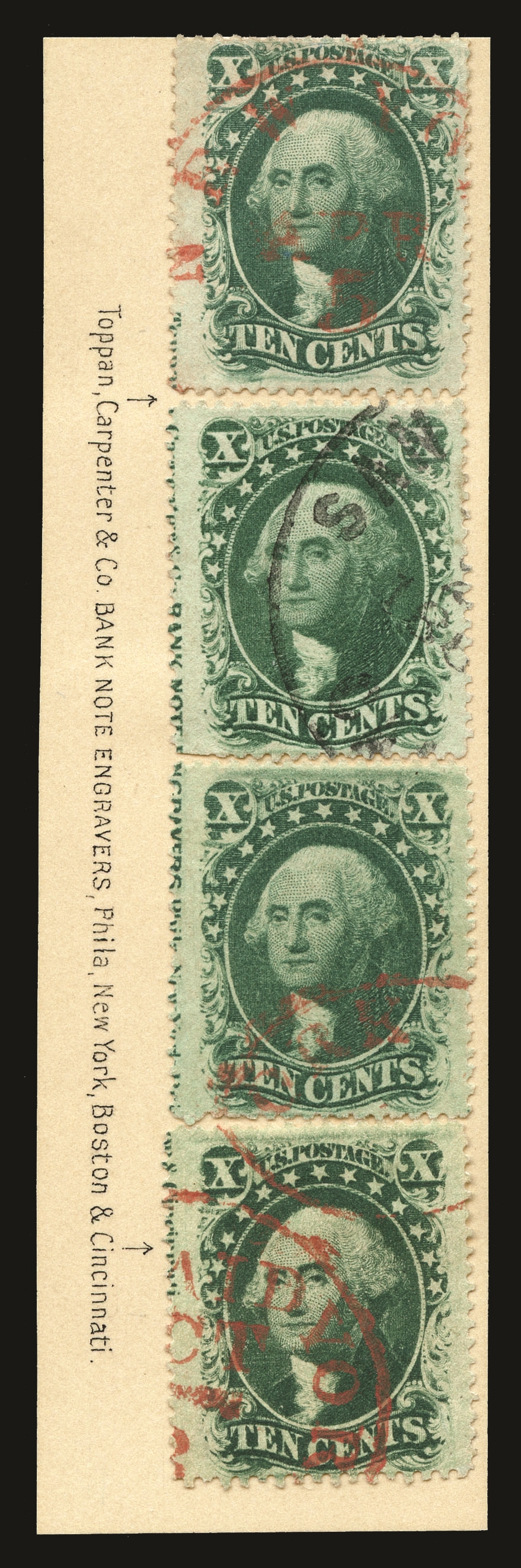 (35) 1857-61 10¢ Green Washington Type V used reconstruction of imprint, comprising four singles mounted vertically on a custom display card to visually reconstruct the imprint margin reading “Toppan, Carpenter & Co. BANK NOTE ENGRAVERS, Phila. New York, Boston & Cincinnati.” Three stamps with red cds cancels and the fourth with a black CDS. A striking and ideal for an exhibitor or specialist in the 10c stamps of Toppan, Carpenter, v.f.
